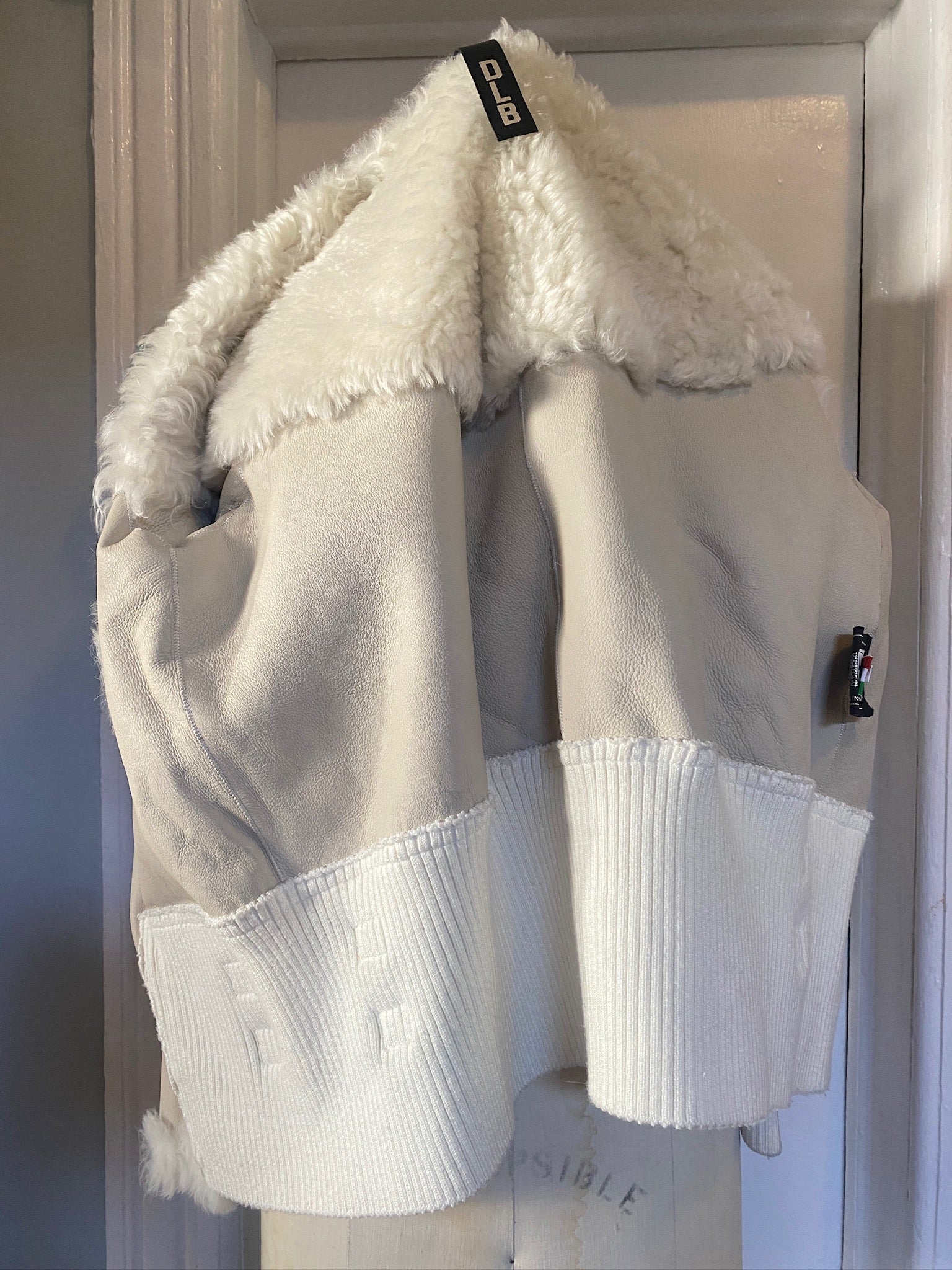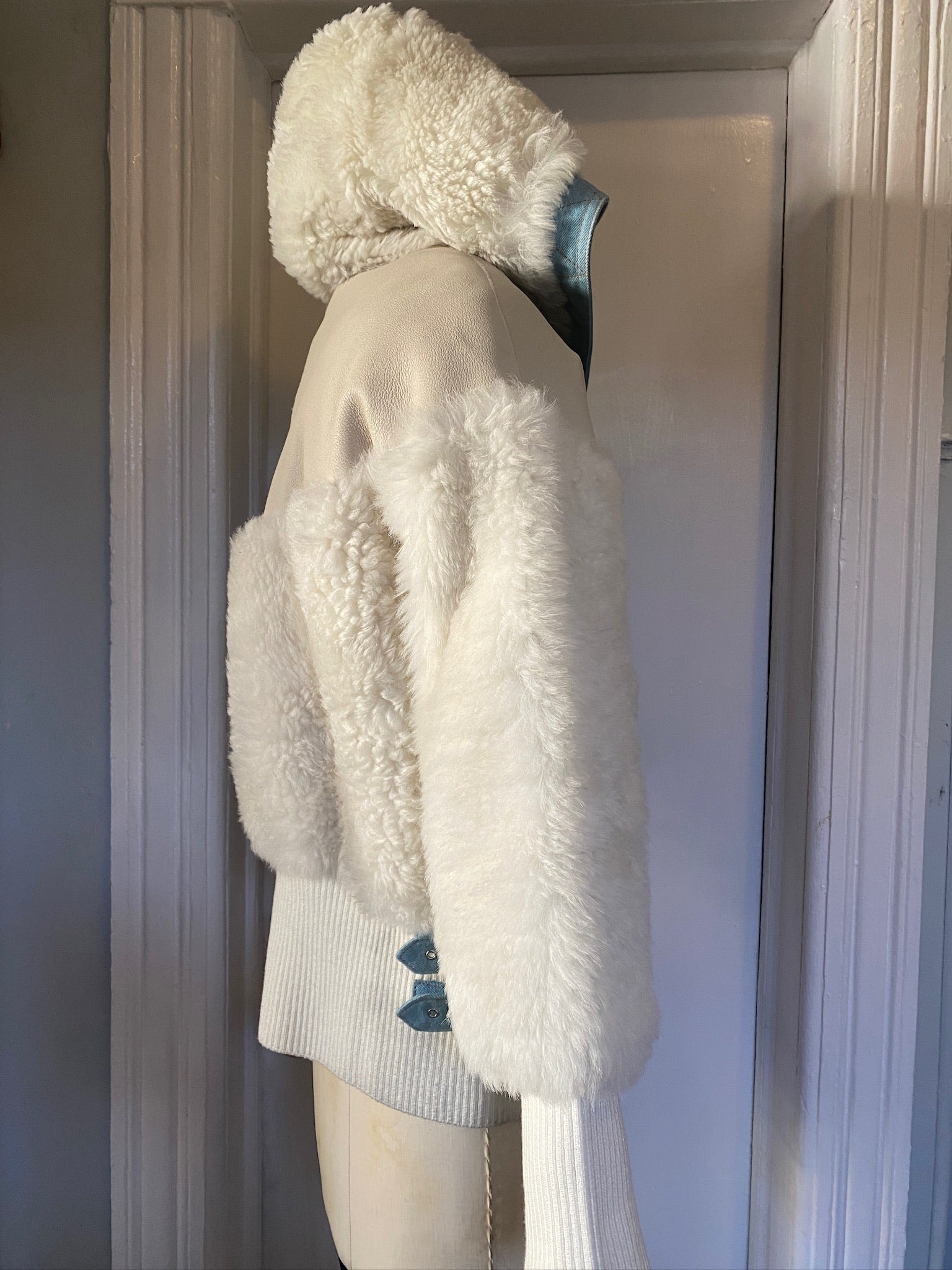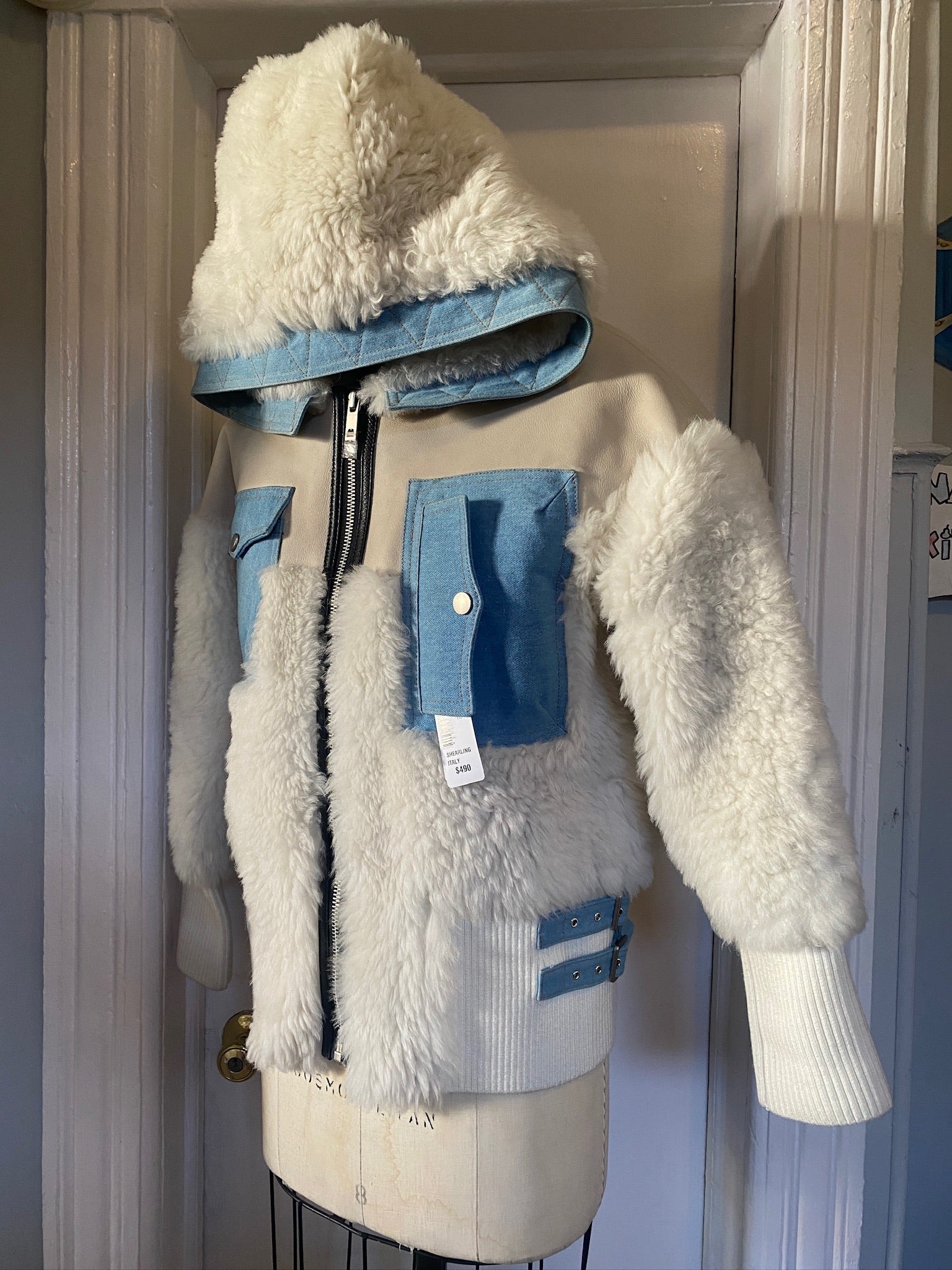 DLB Italy Fur Shearling, leather, denim hooded jacket, Size M/L/42 (New With Tags) FREE SHIPPING