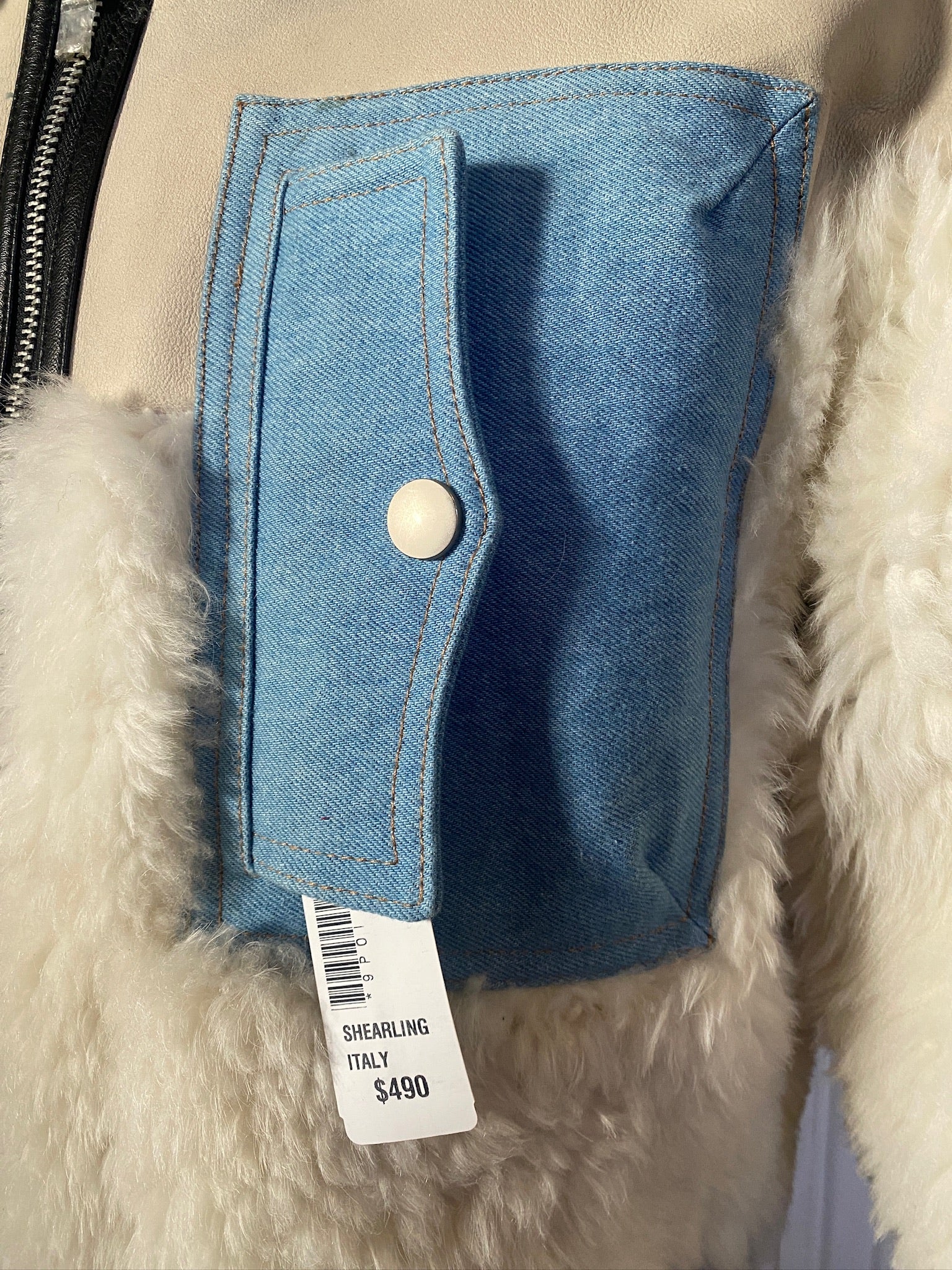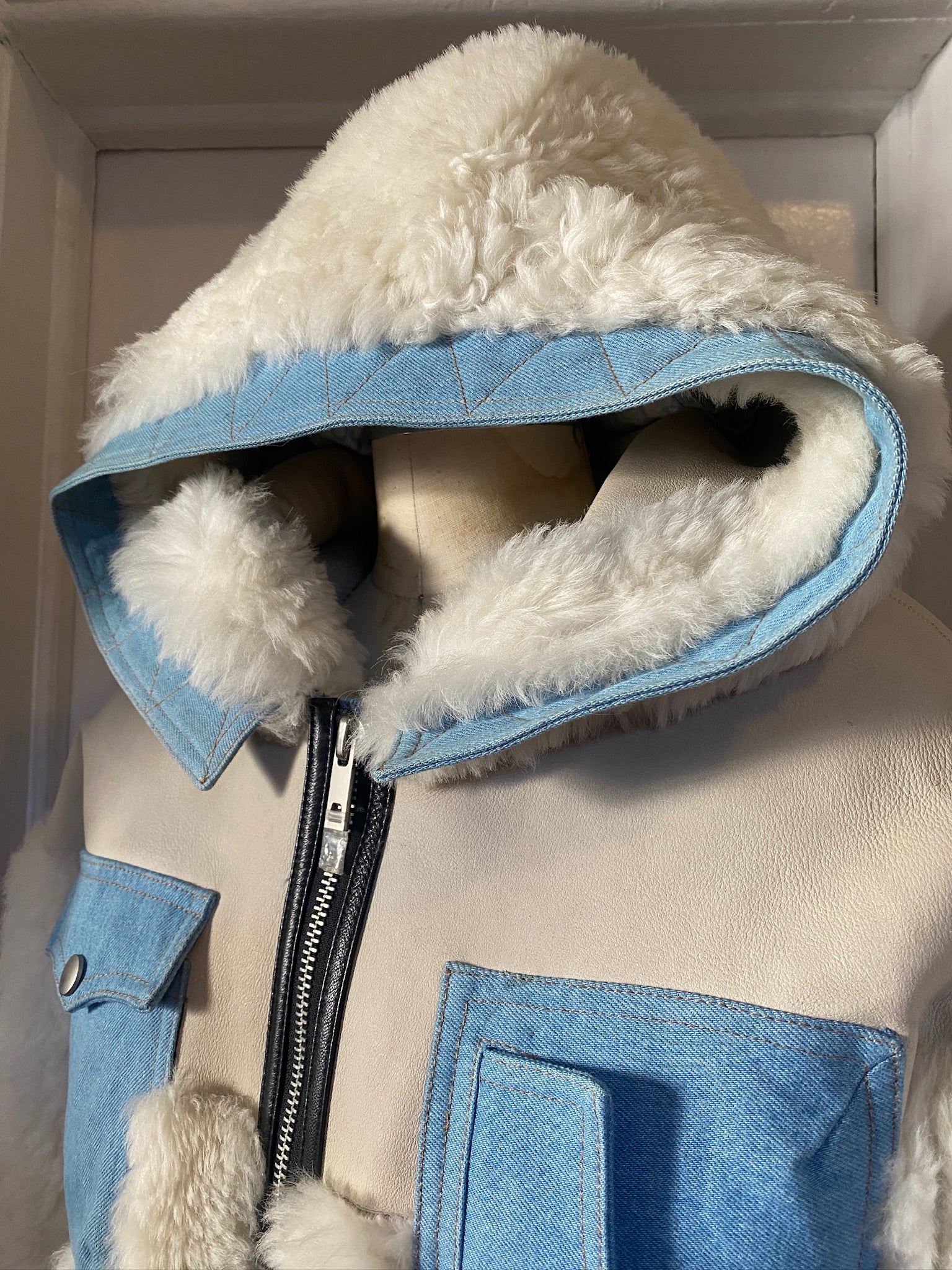 Never Worn, New with Tags Leather, fur and denim OH MY! Fur also inside and outside of the hood!. Super warm and stylish, and Made in Italy. Never been worn and still has the tags. Please see all the pictures for the condition.