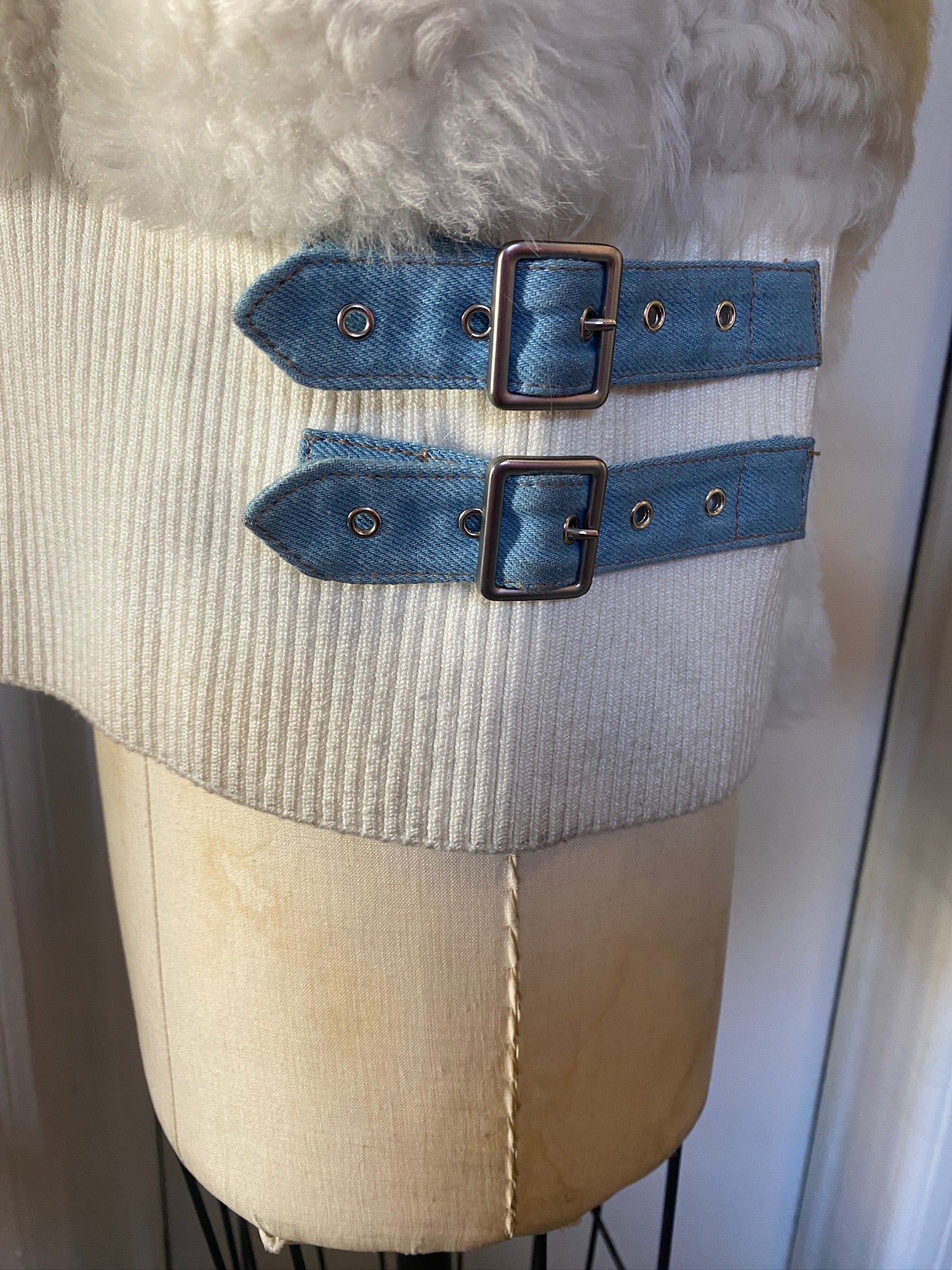 The last picture two pictures of the cuff and side shows some dark discoloration of when it was stored next to a dark denim material that rubbed off on in. Not that noticeable, and could be spot cleaned at the dry cleaner when ready. This is why the price has been marked down.