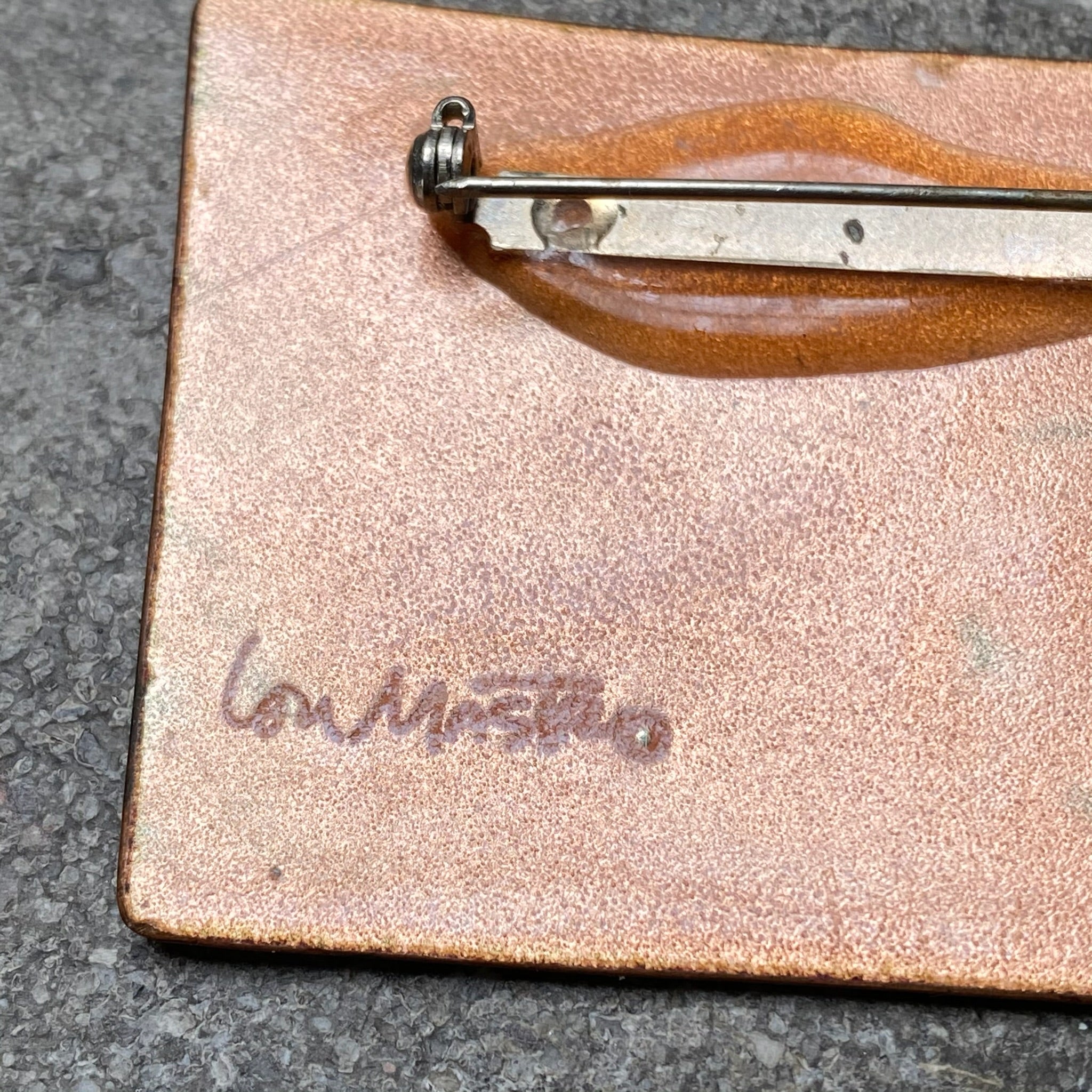 The back shows a typical pin mechanism and a handwritten signature style "Lou Mastro" that matches Mastro's known style of signing his copper works. The textured, shimmering surface is a result of copper enameling, a process where powdered glass is fused to the metal at high temperatures. The copper base is coated with a clear or lightly tinted enamel "counter-enamel" on the back to prevent the piece from warping during the high-heat firing process. The "bubbled" or shimmering look is achieved through high-heat kiln firing. The back of the brooch shows a standard pin-and-clasp mechanism common to mid-century jewelry.