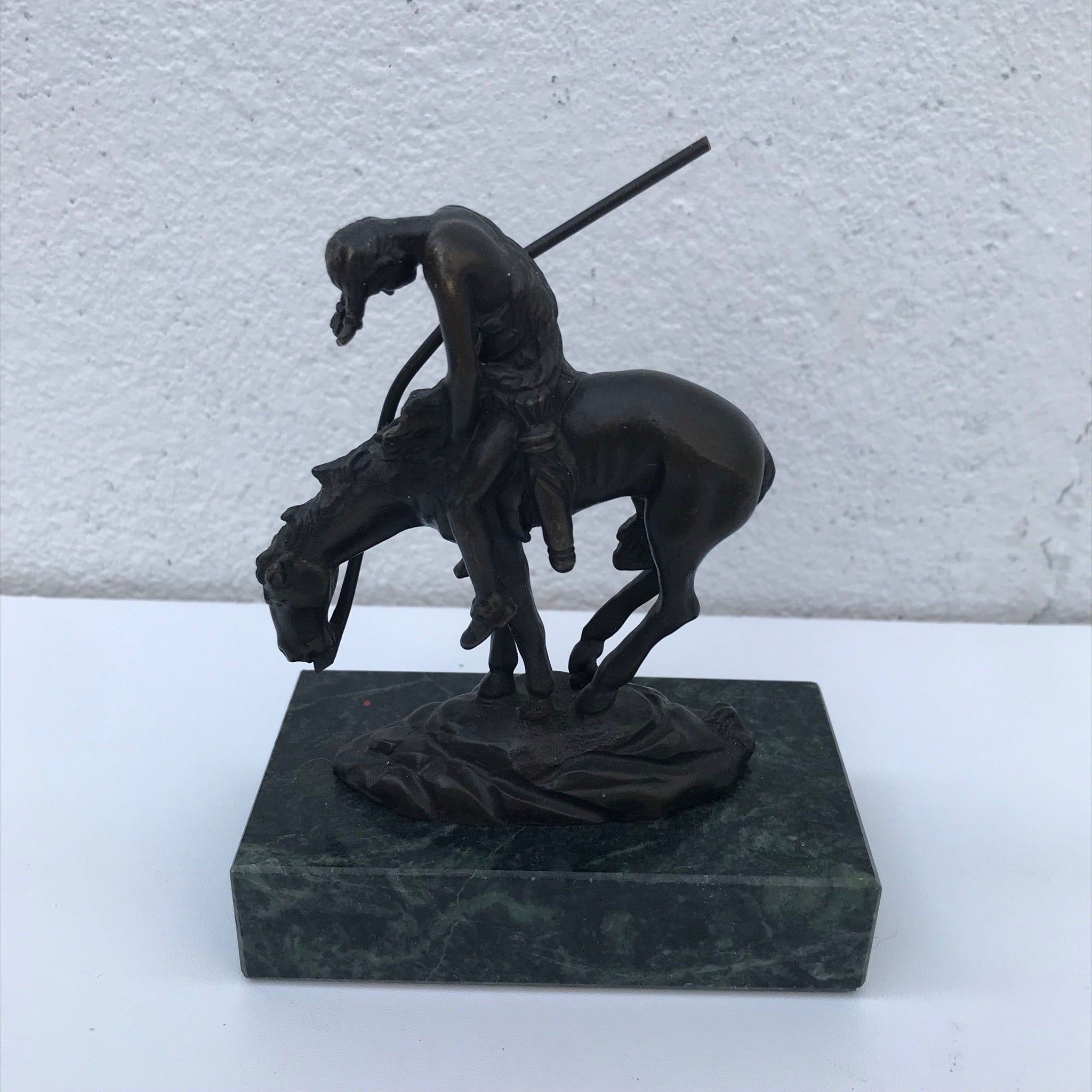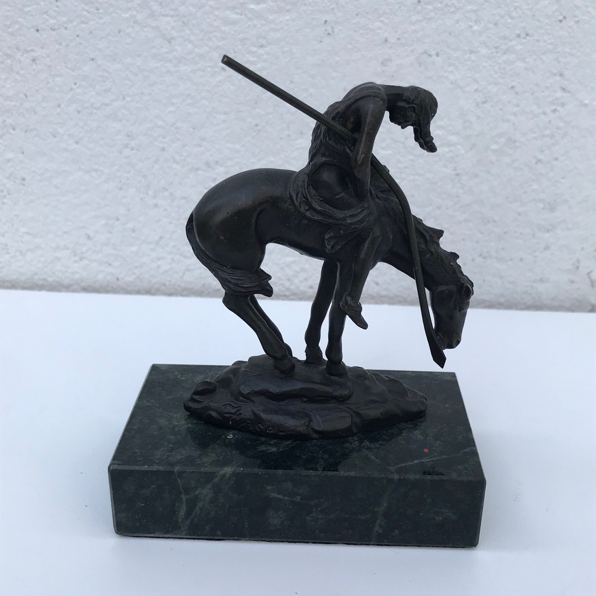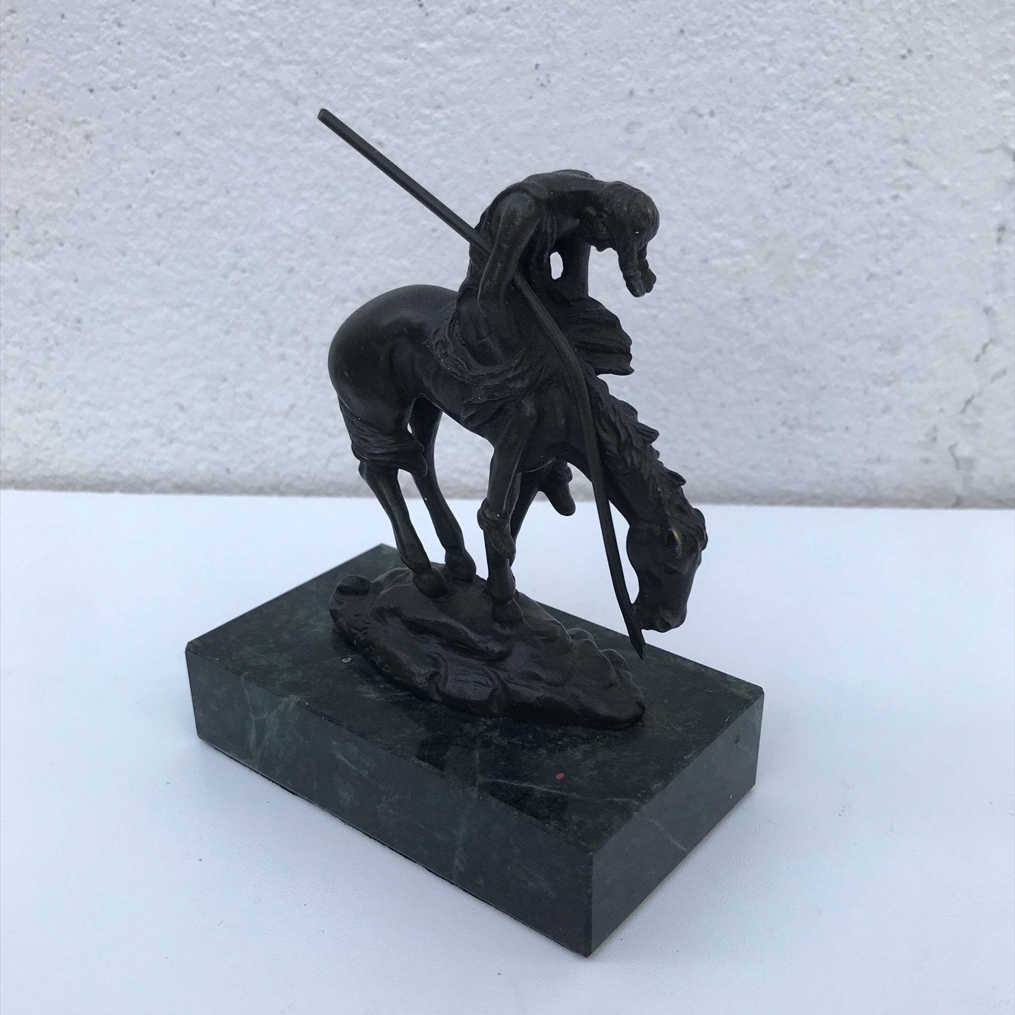 Here is a small vintage bronze sculpture on a green marble base. End of Trail by James Earle Fraser. Signed Fraser.