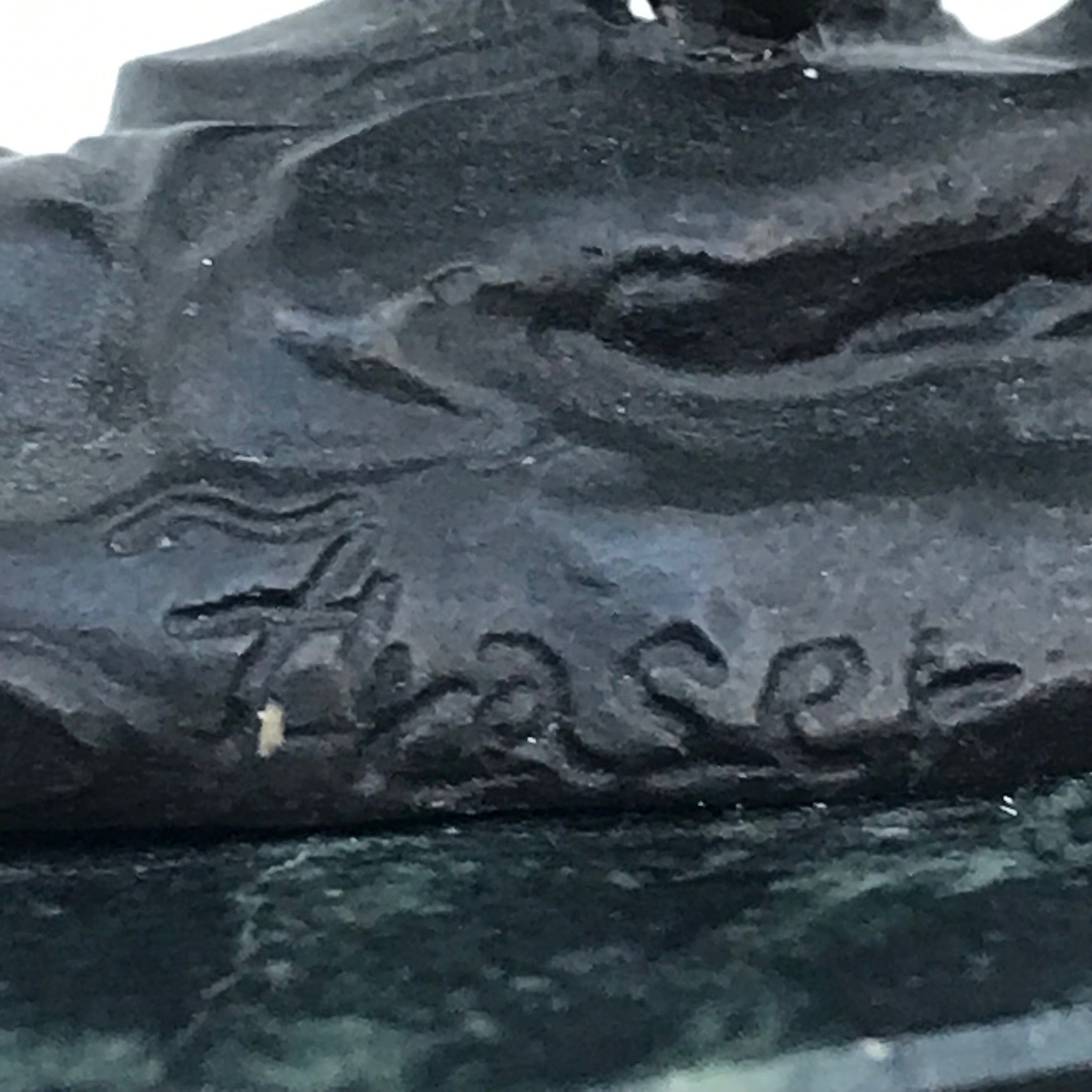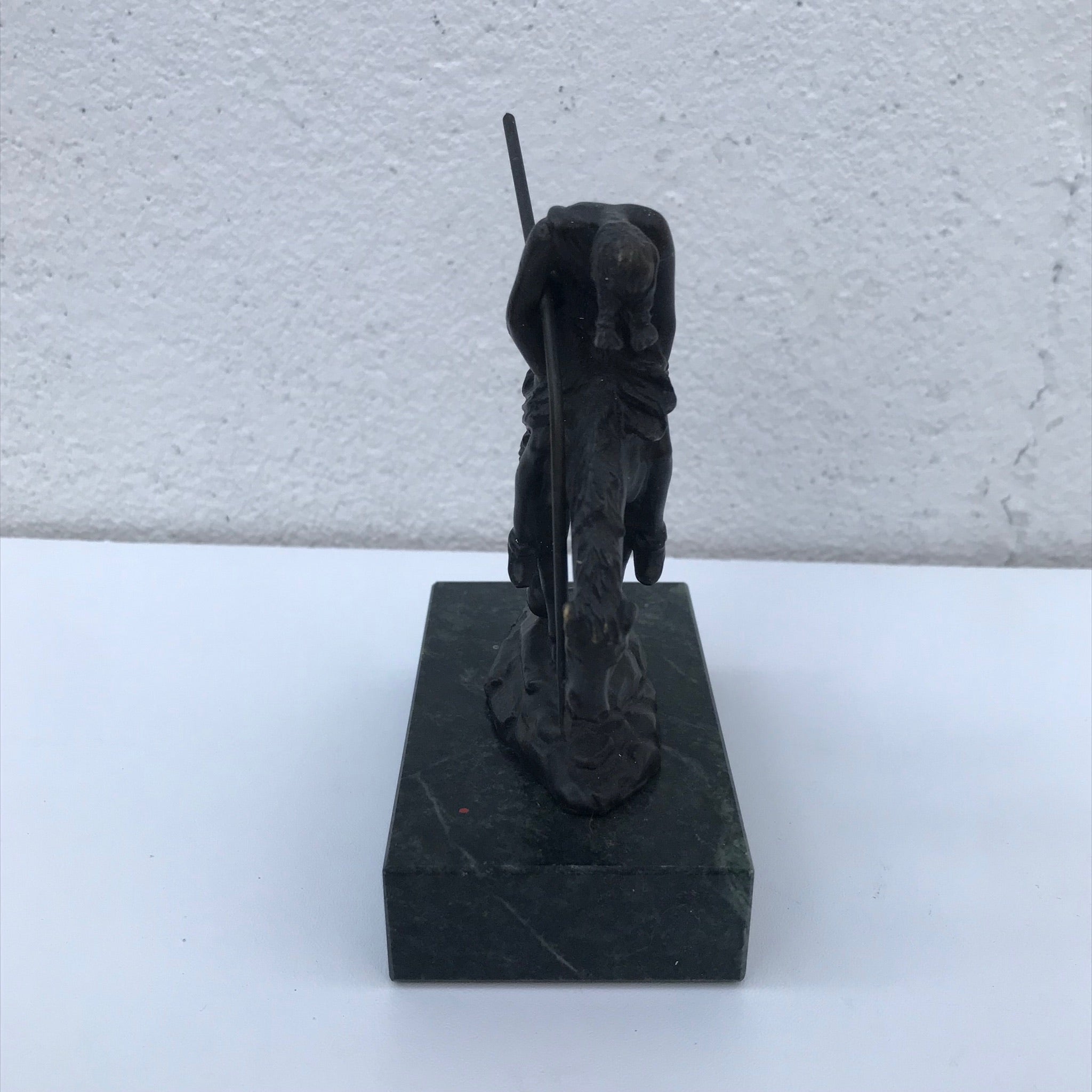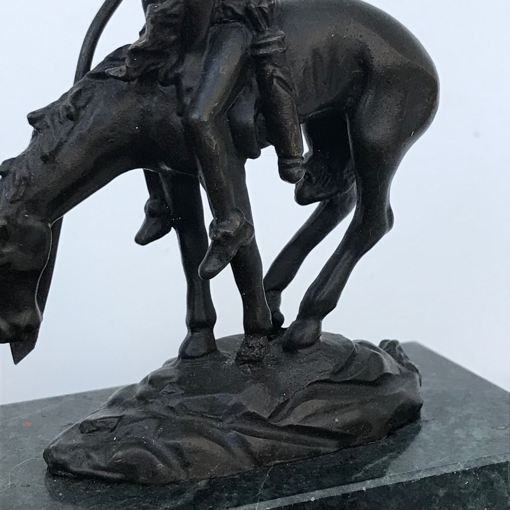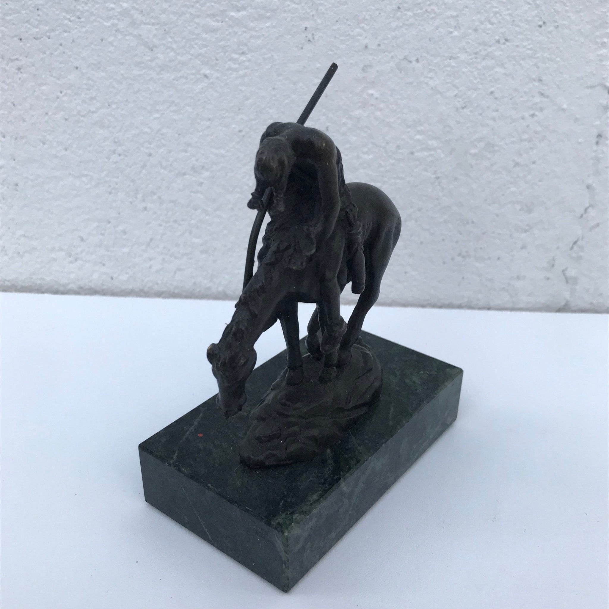 Here is a small vintage bronze sculpture on a green marble base. End of Trail by James Earle Fraser. Signed Fraser.