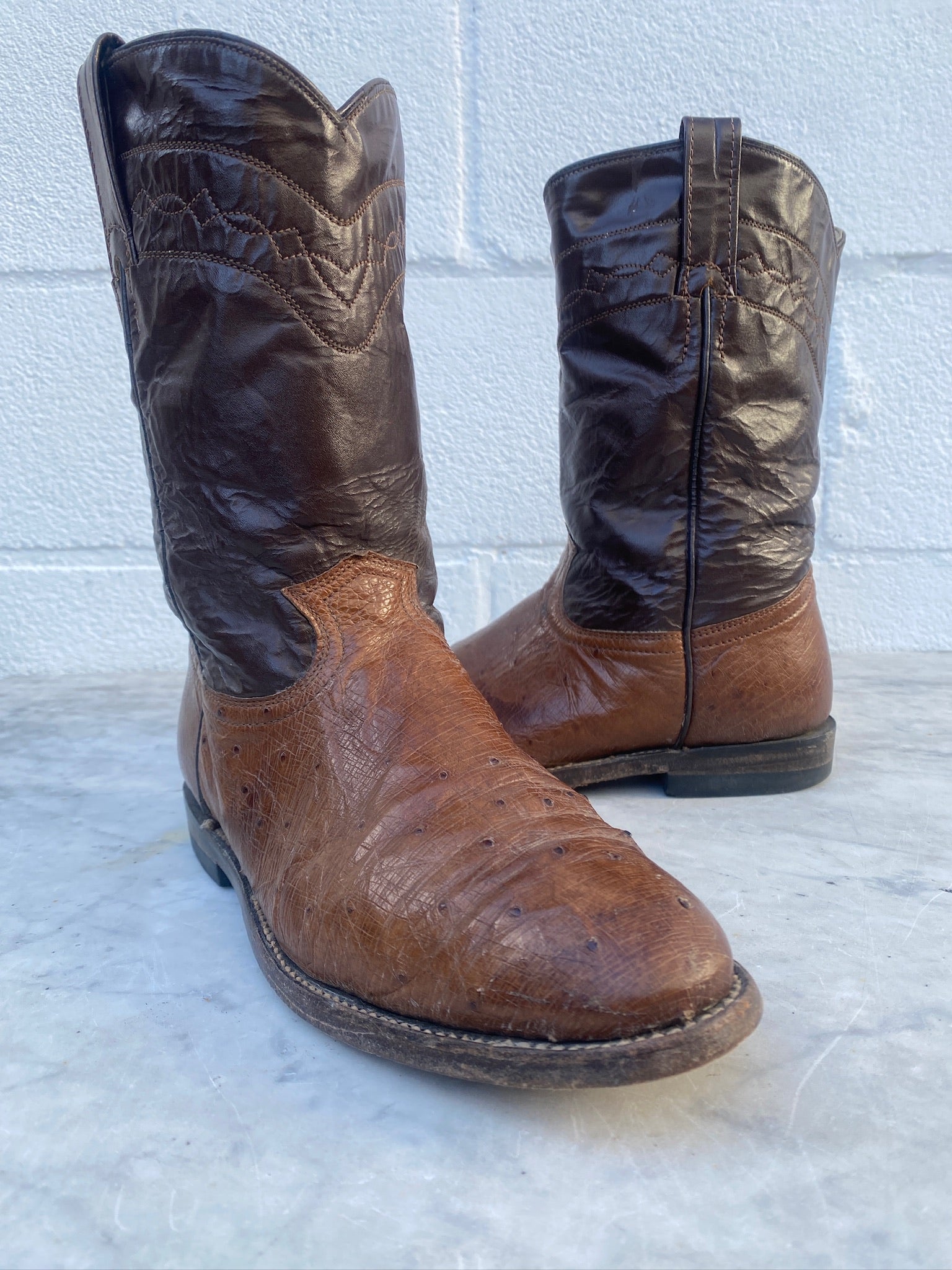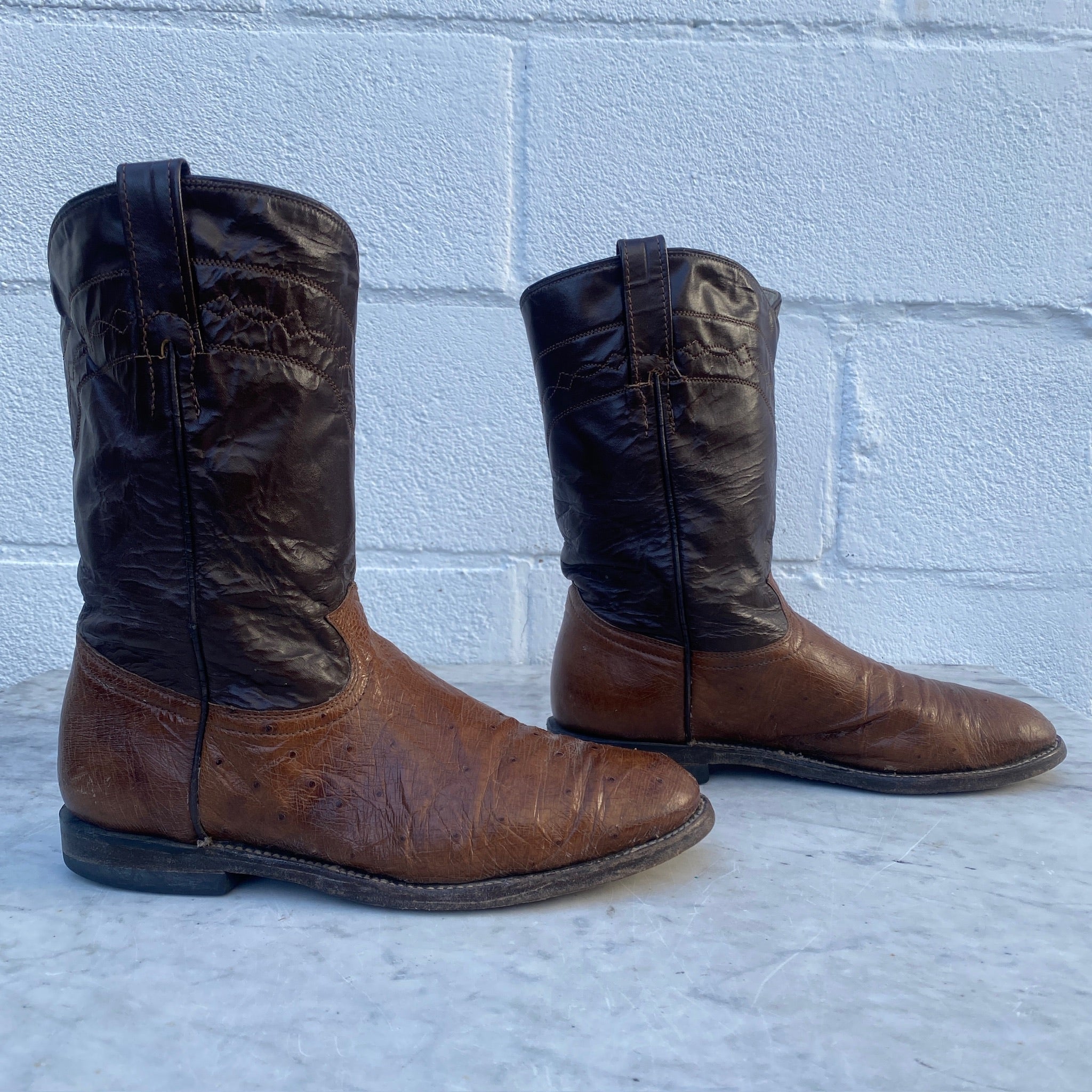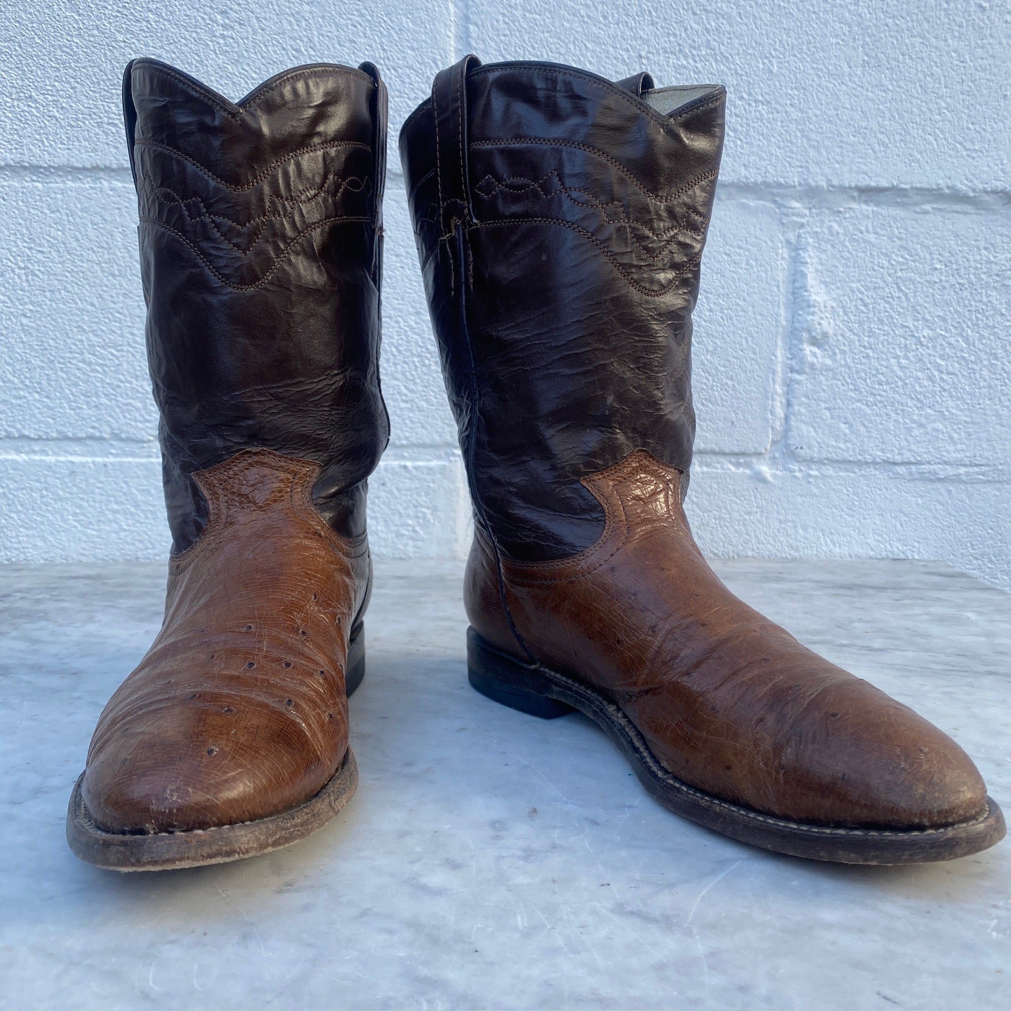 Vintage Mens 6.5 D Roper Style Two tone brown Ostrich / Leather Cowboy boots by Cowtown Boots / Made in Mexico FREE SHIPPING