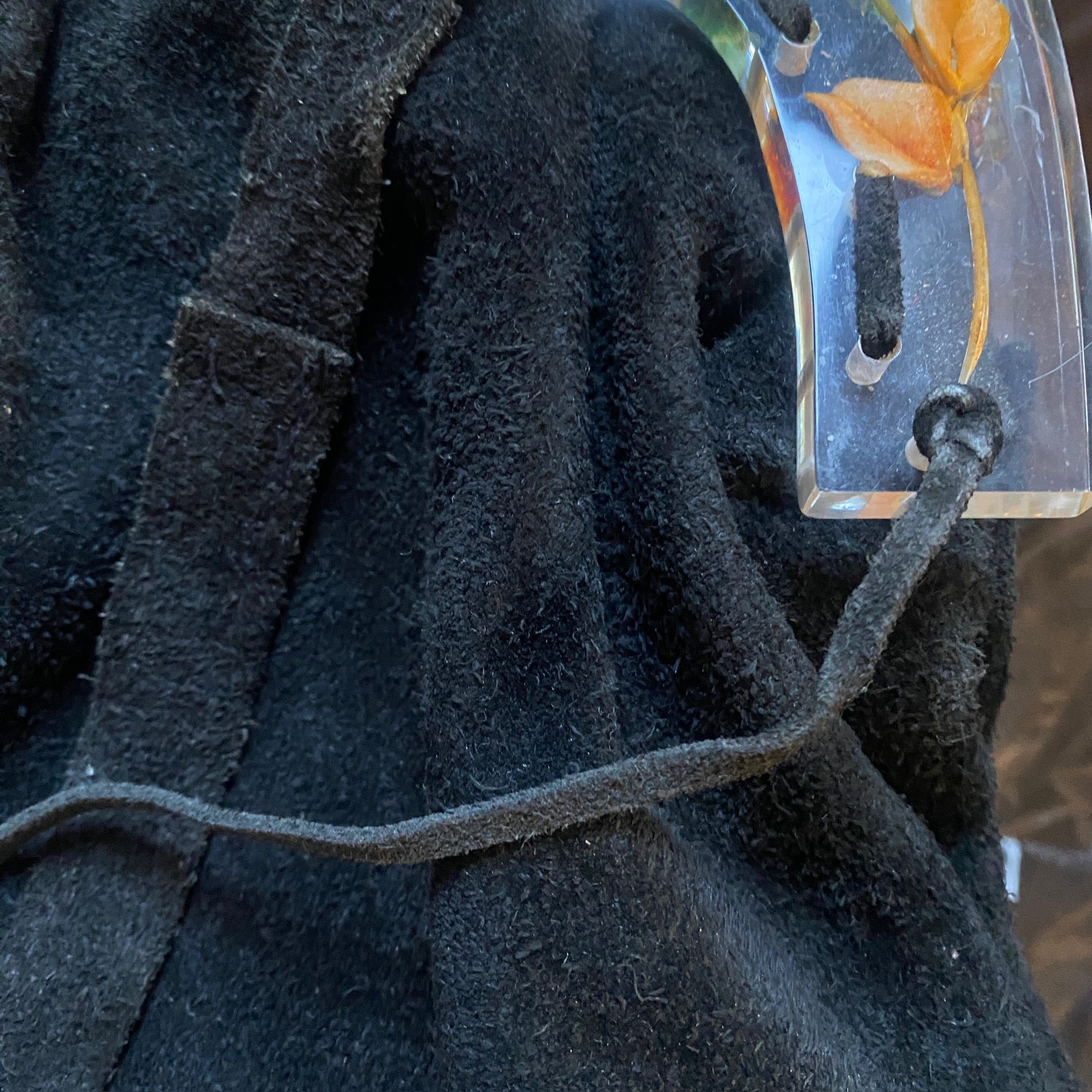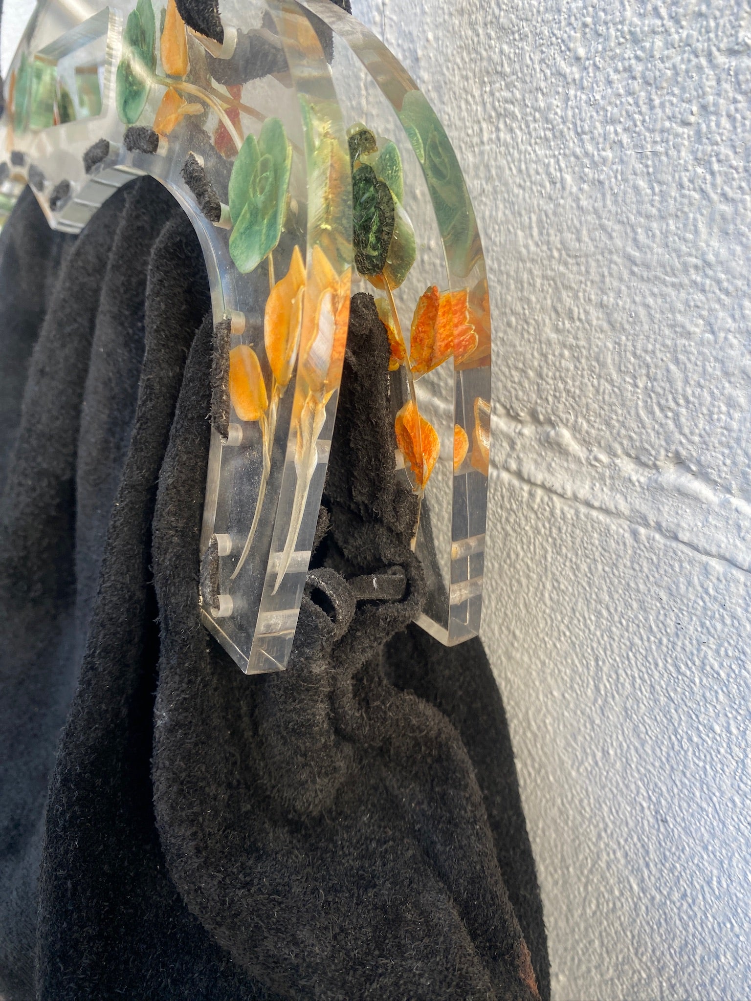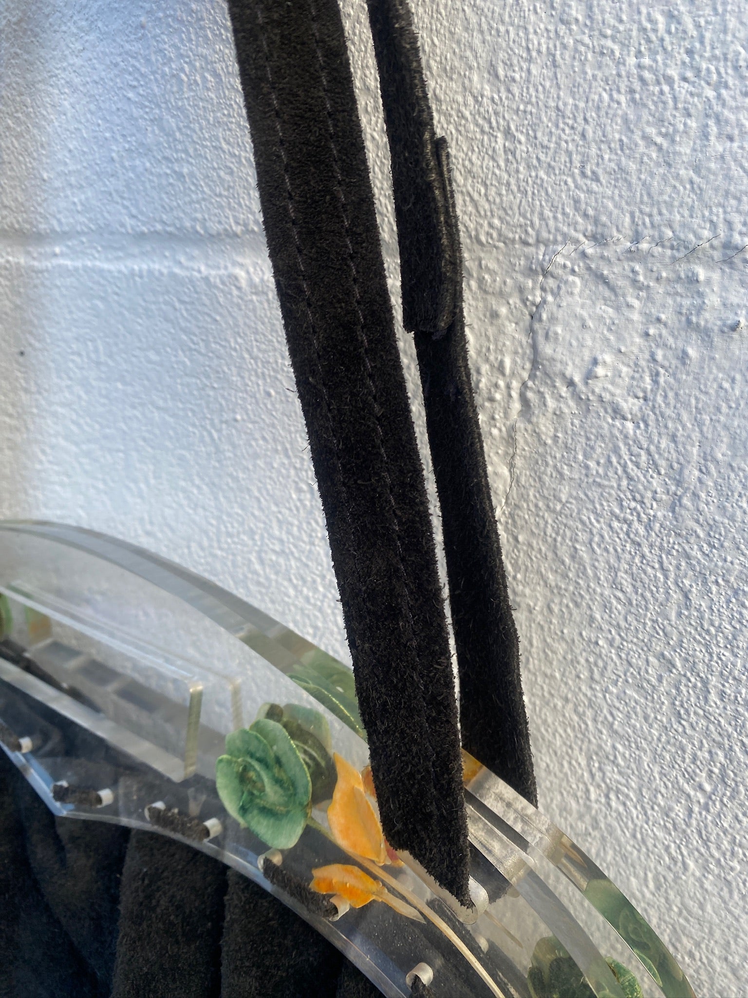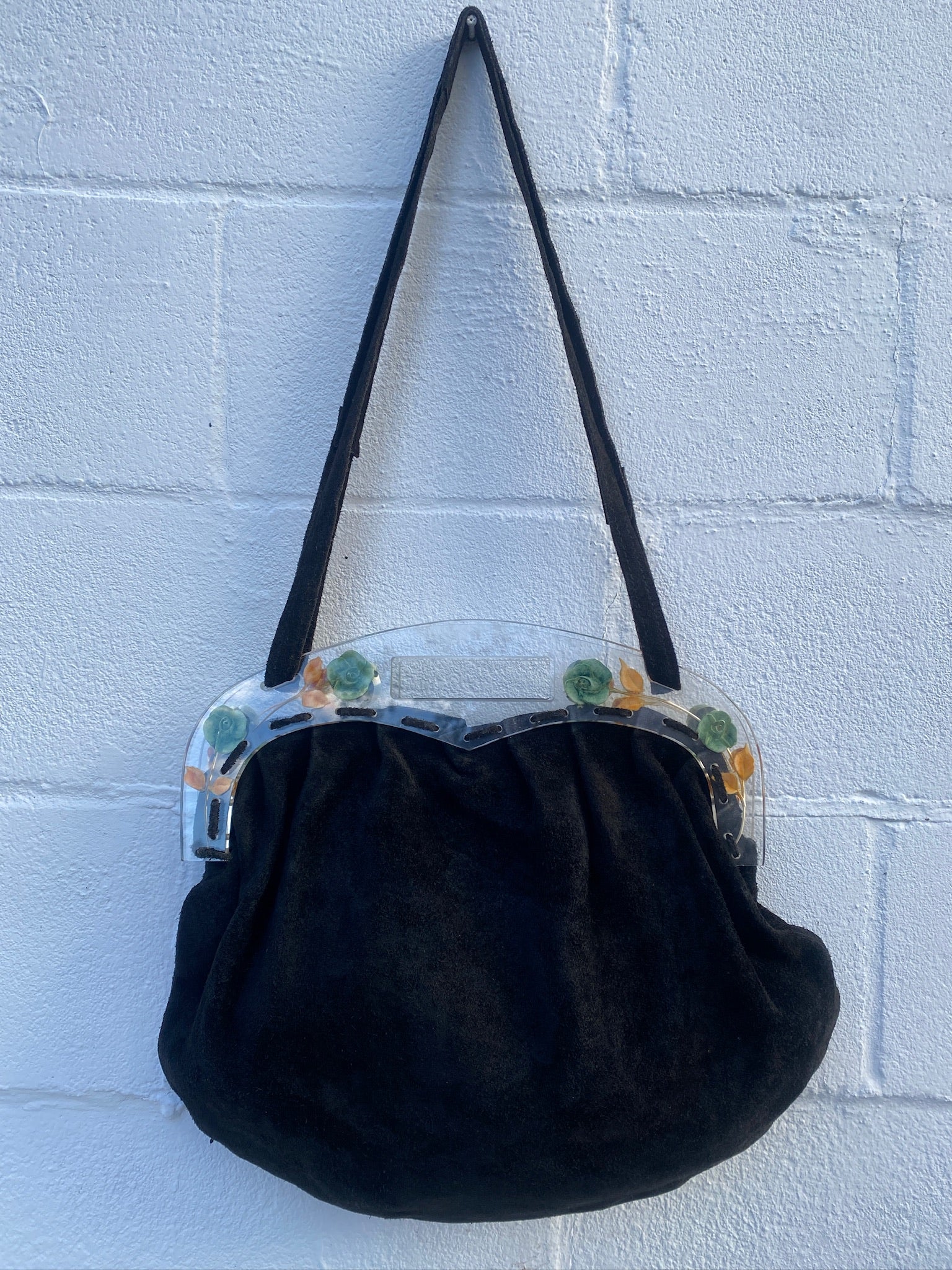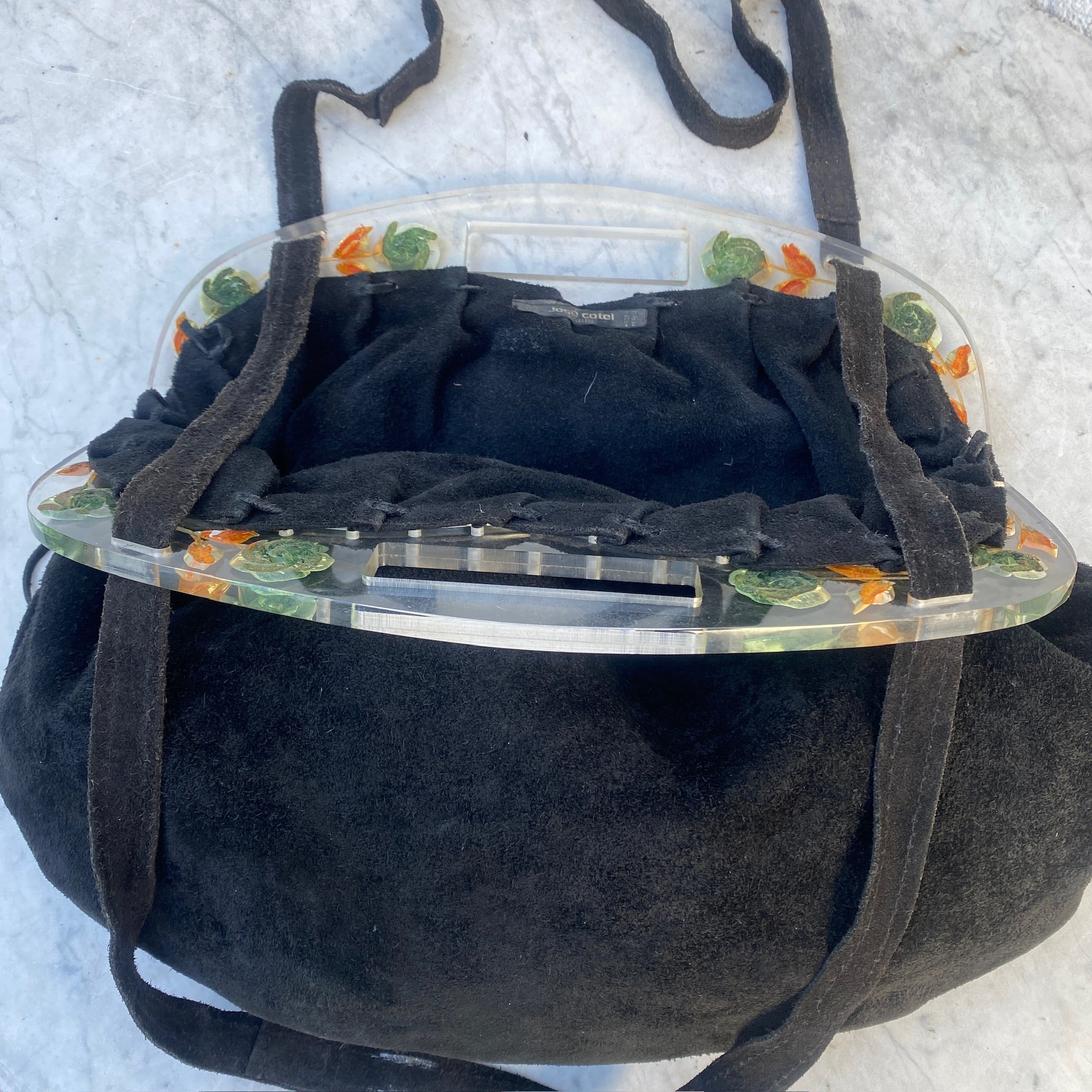 RARE Collectible 1980's José Cotel Paris suede handbag with reverse carved lucite floral handle Large Handbag with a long shoulder strap for versatility.