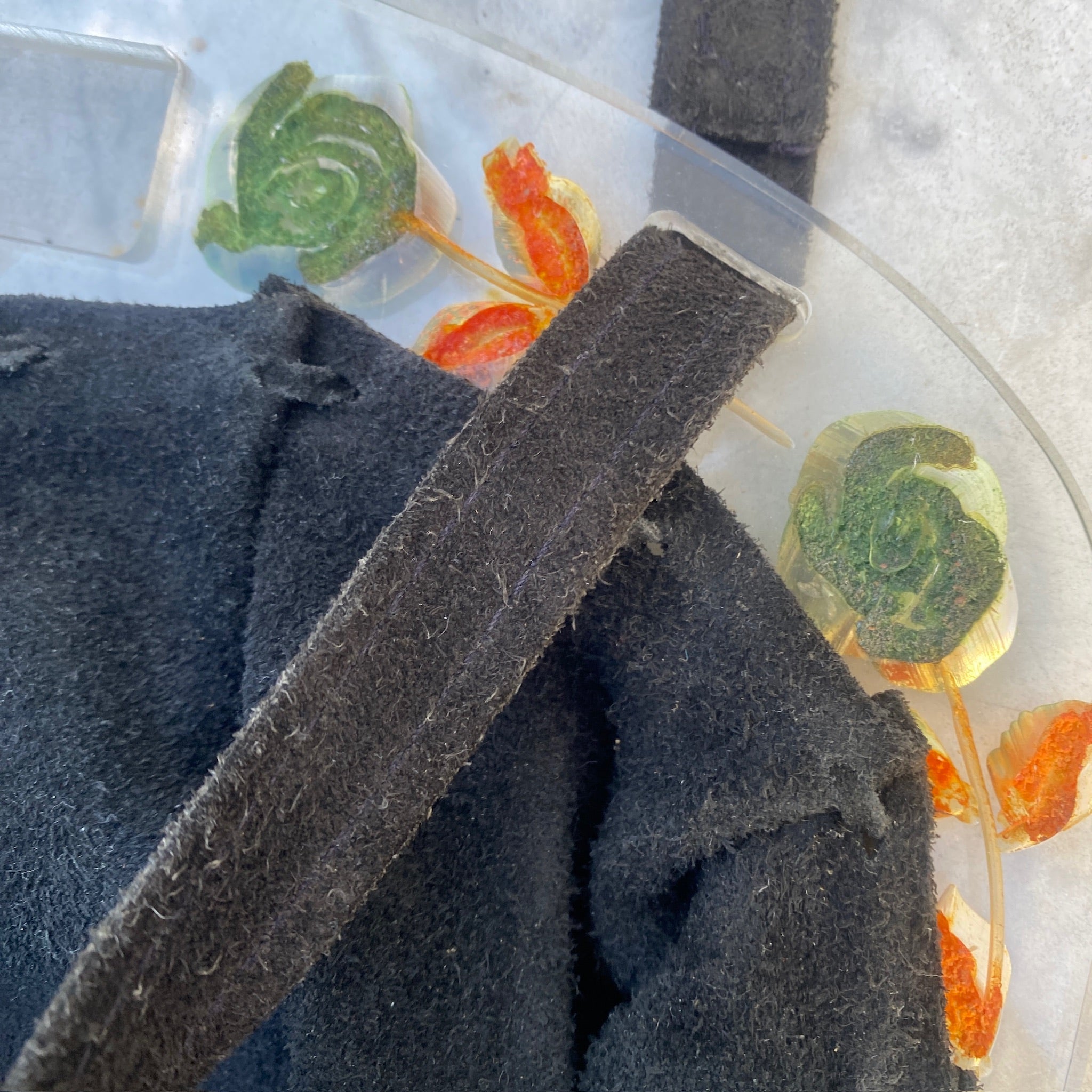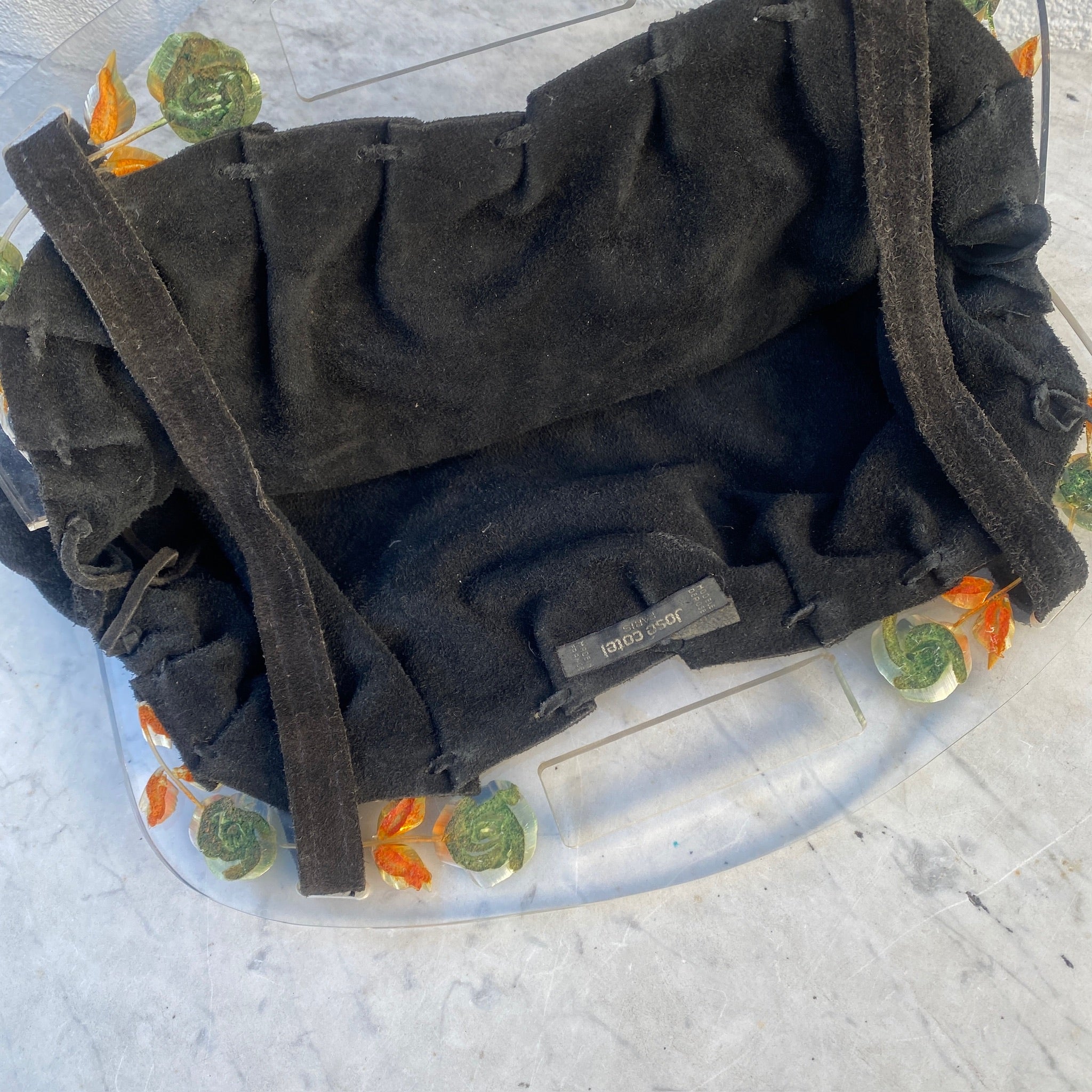 RARE 1980's José Cotel Paris Suede Handbag with reverse carved Lucite floral handle -Couture Parisian French Designer FREE SHIPPING