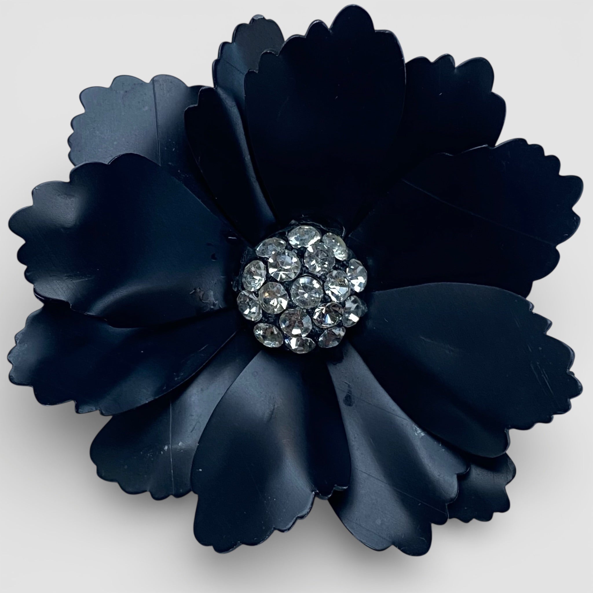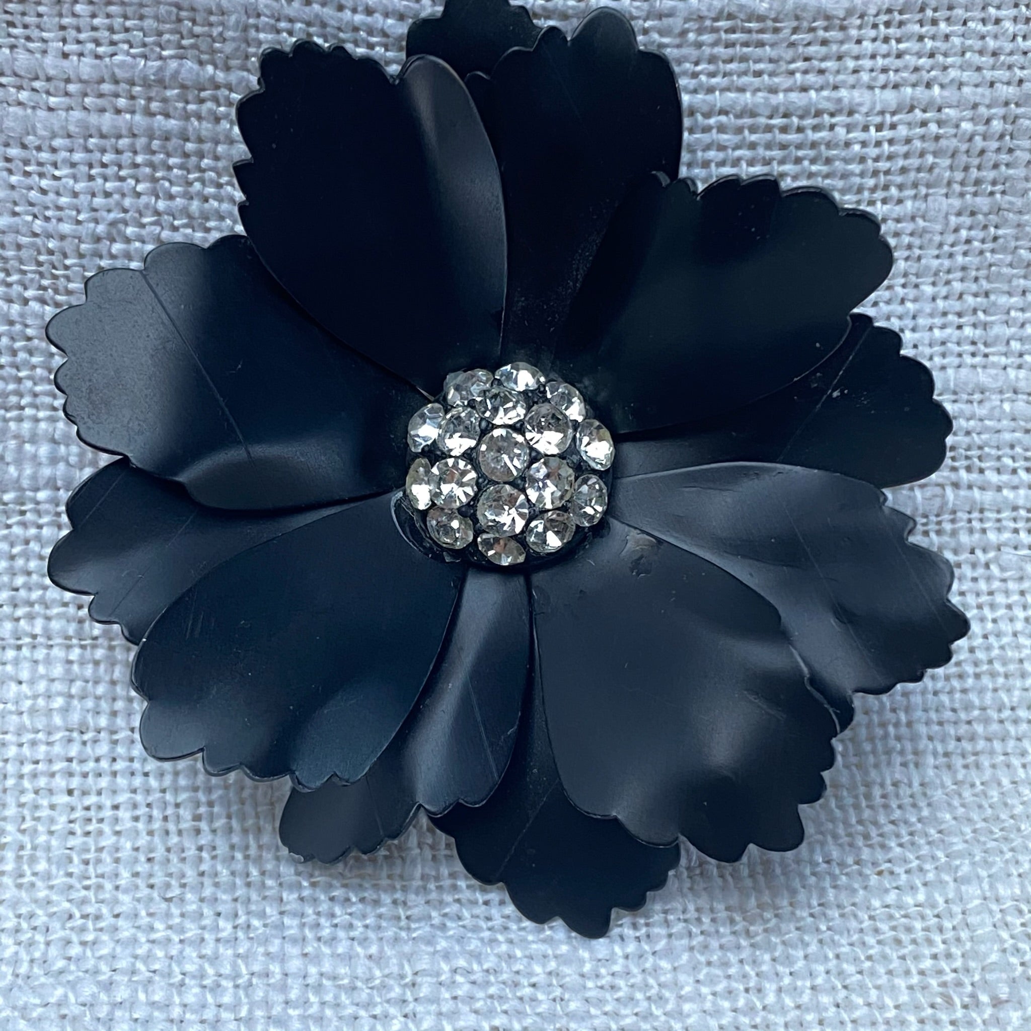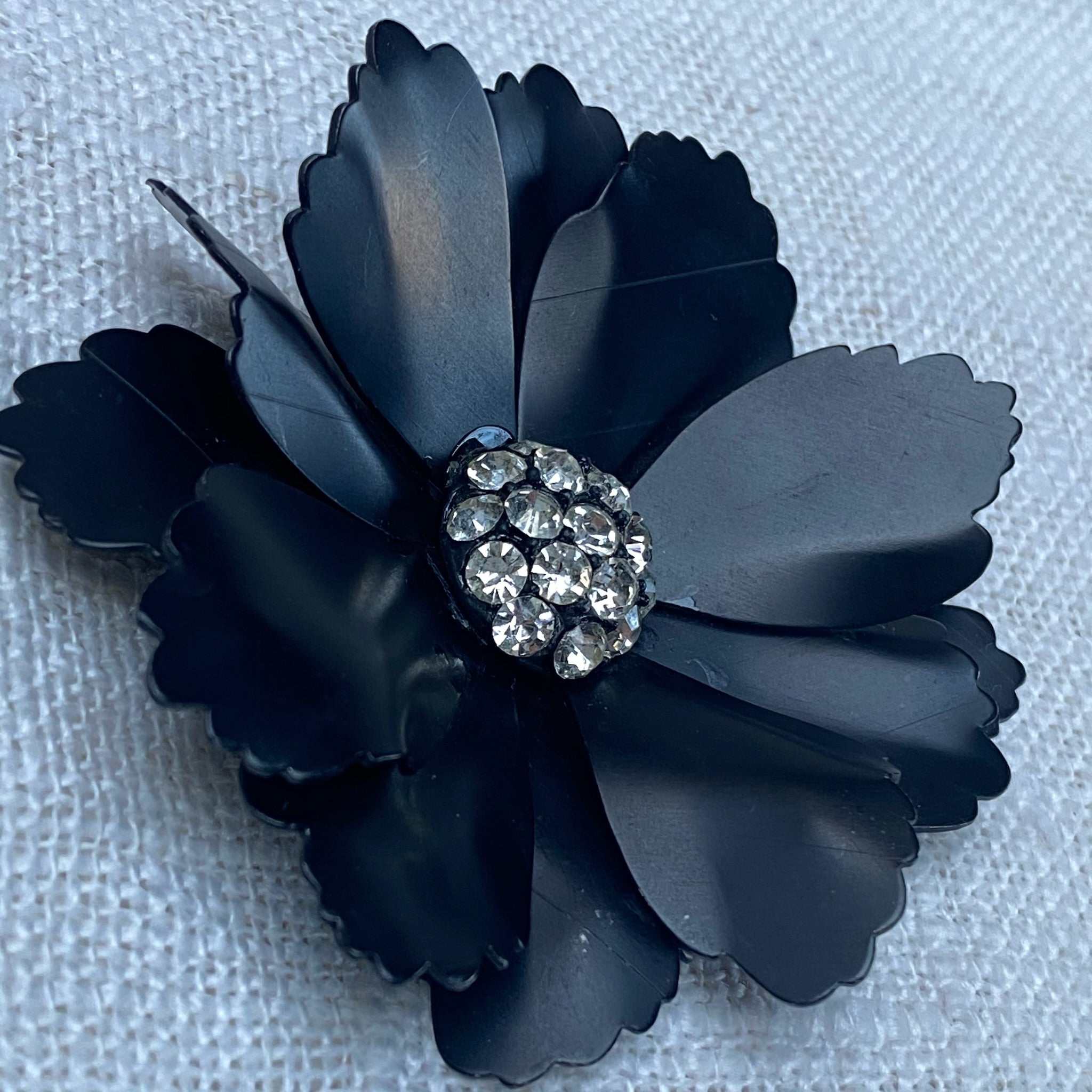 1950s Large Black Metal + Rhinestone Mid Century Flower Brooch. FREE SHIPPING