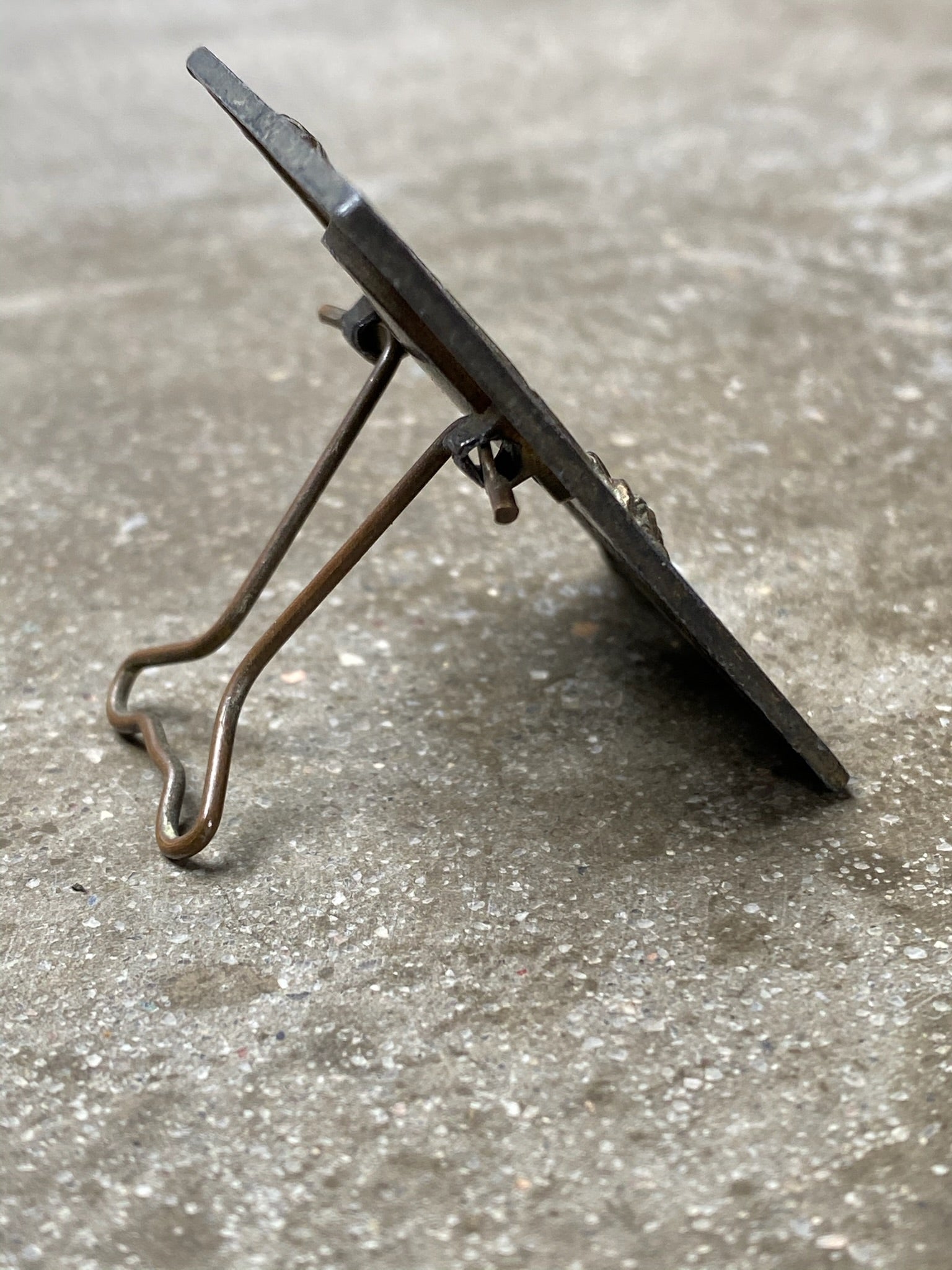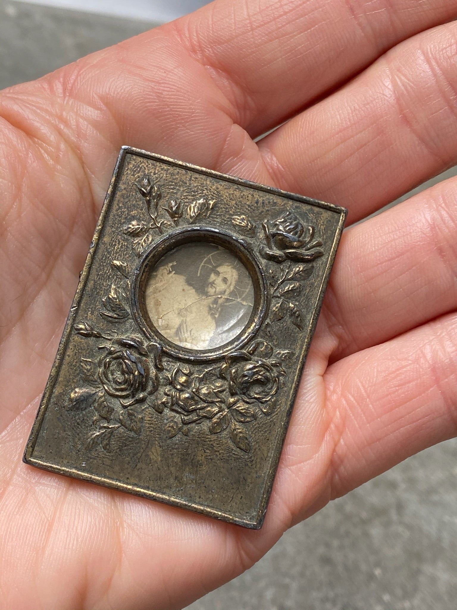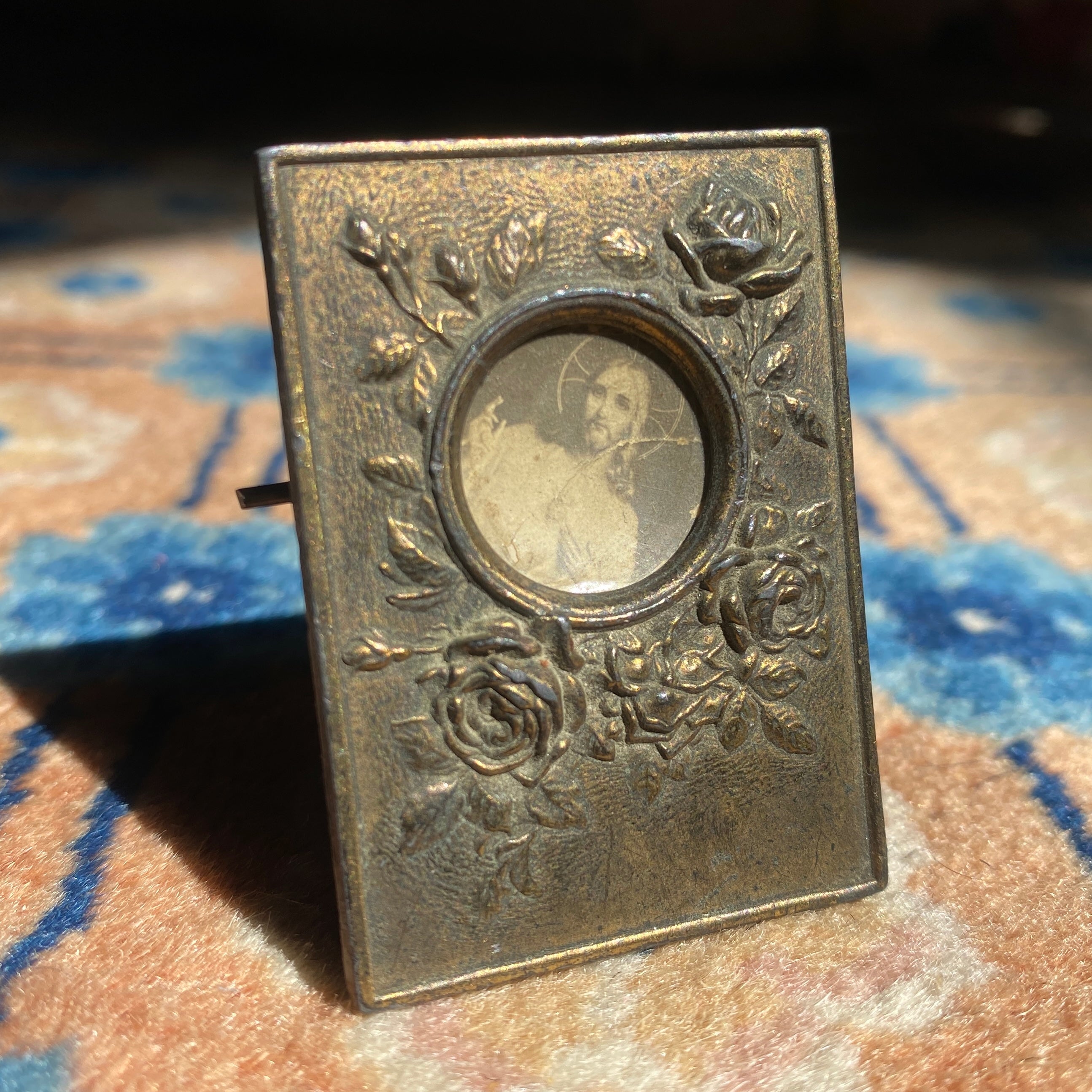 Antique 1890's miniature French Art Nouveau brass picture frame featuring original picture with Jesus. Repoussé roses design and easel armature back stand so it can sit on a table or shelf. Made in France.