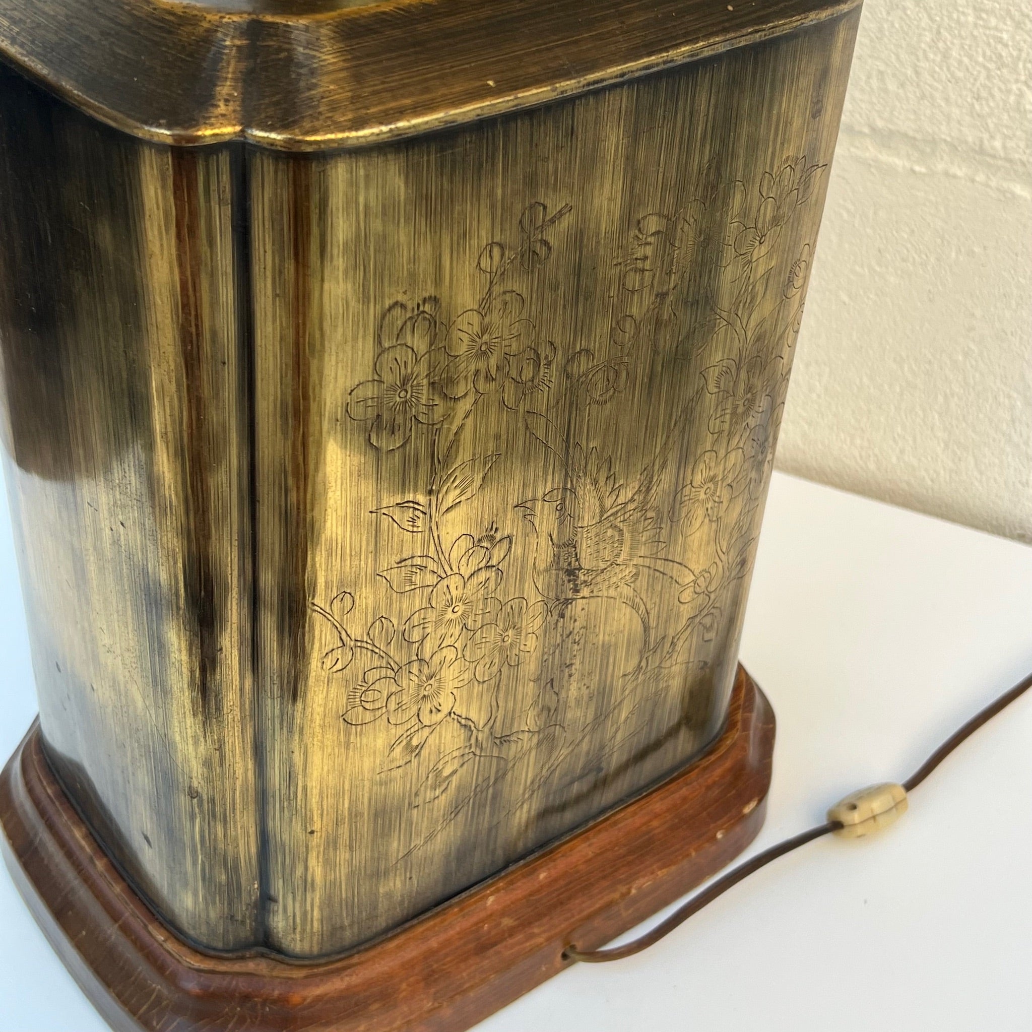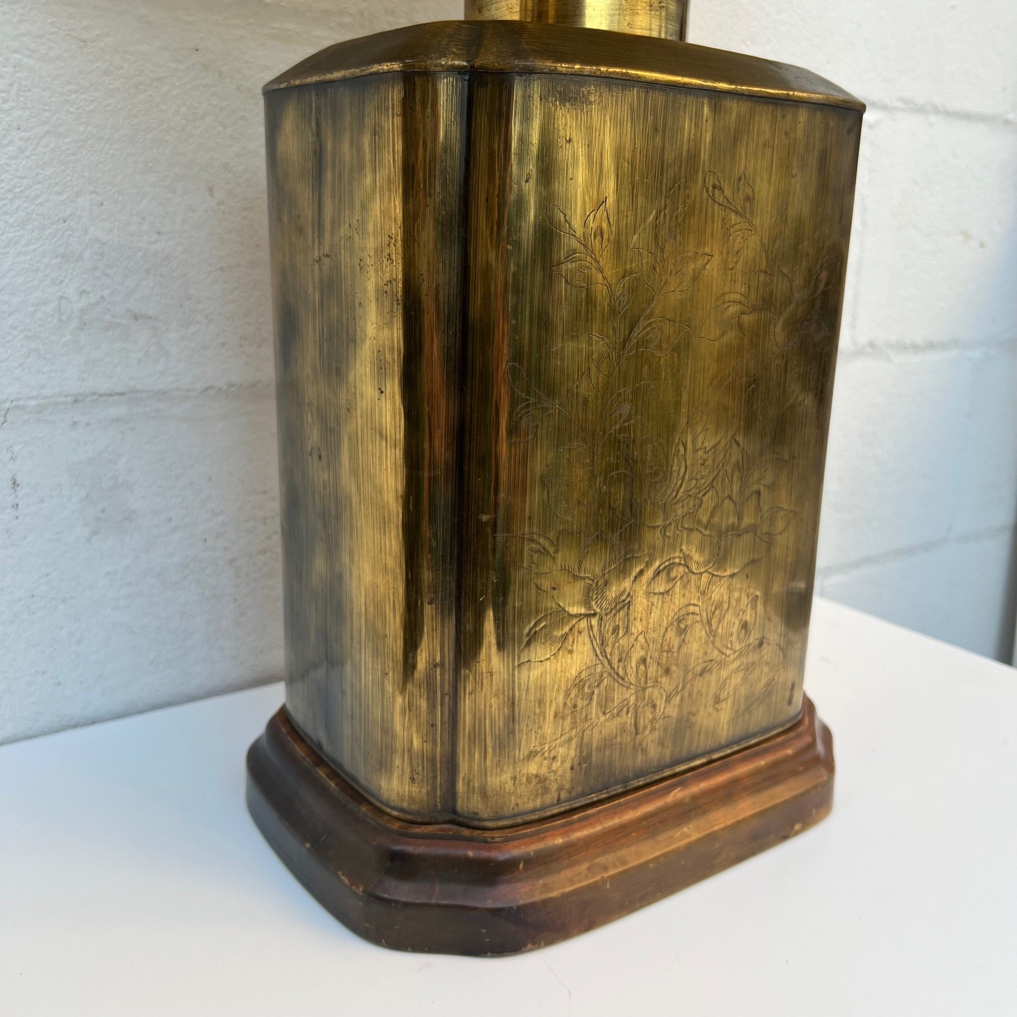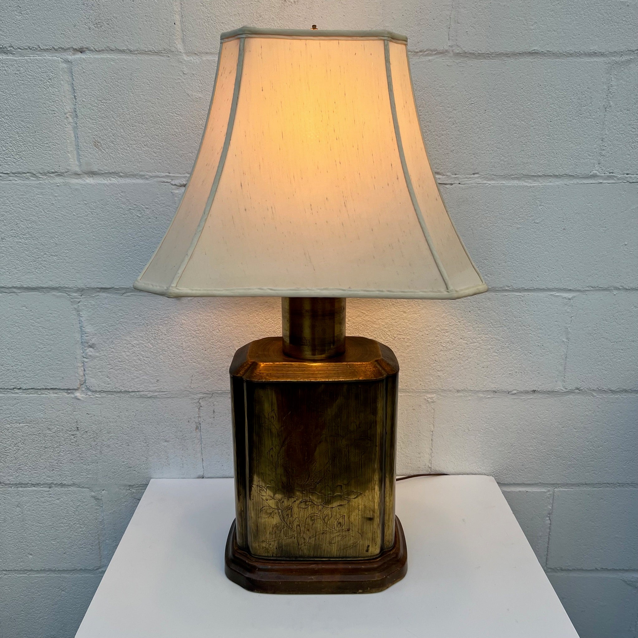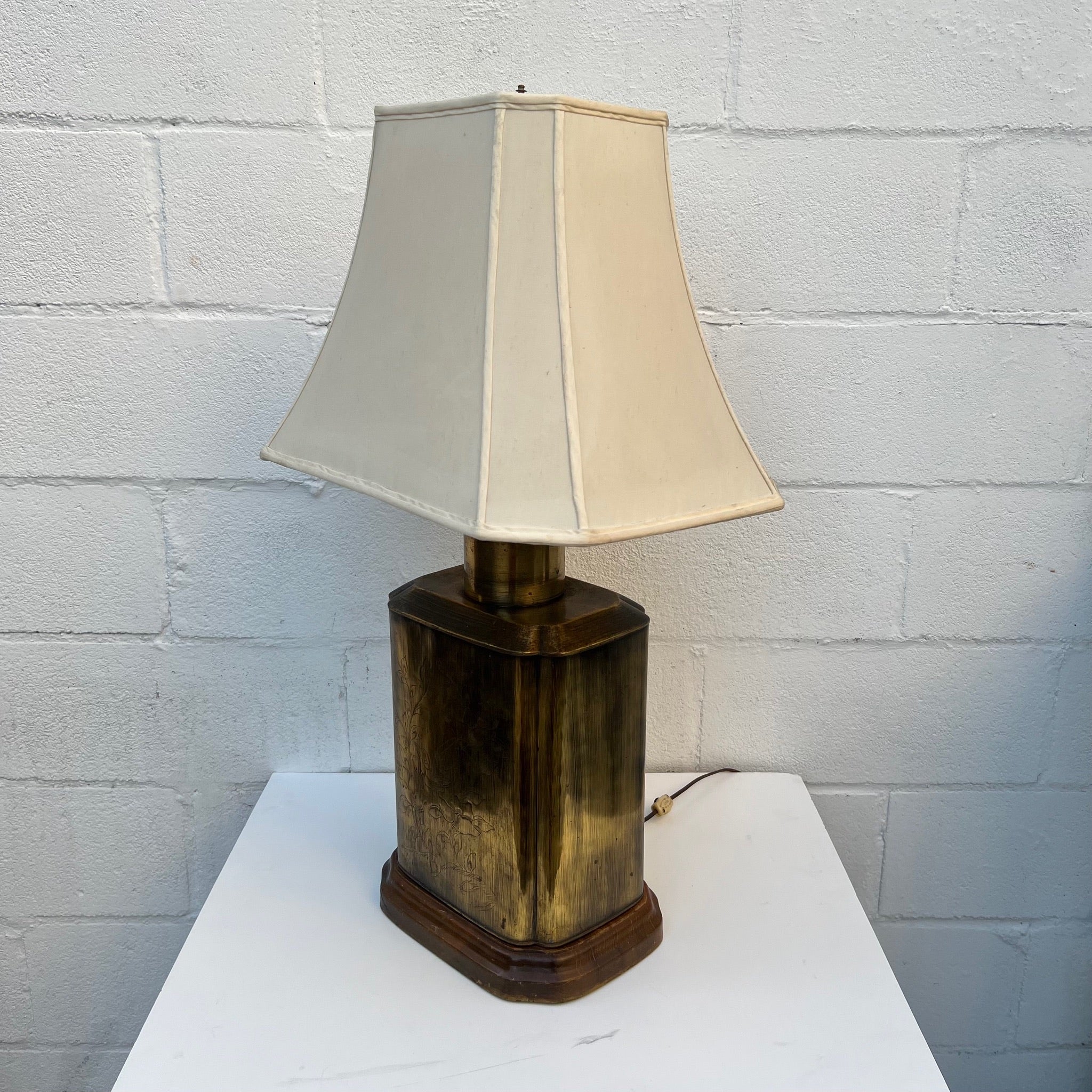 This is ONE LARGE beautiful lamp. Mid Century / Hollywood Regency or Chinoiserie piece - characterized by its brass tea caddy (canister) style base. The lamp features a rectangular, patinated brass body often mounted on a wooden base. Etched Chinoiserie scenes depicting nature, birds, or foliage. Quality off white lined shade, some slight dust on it.