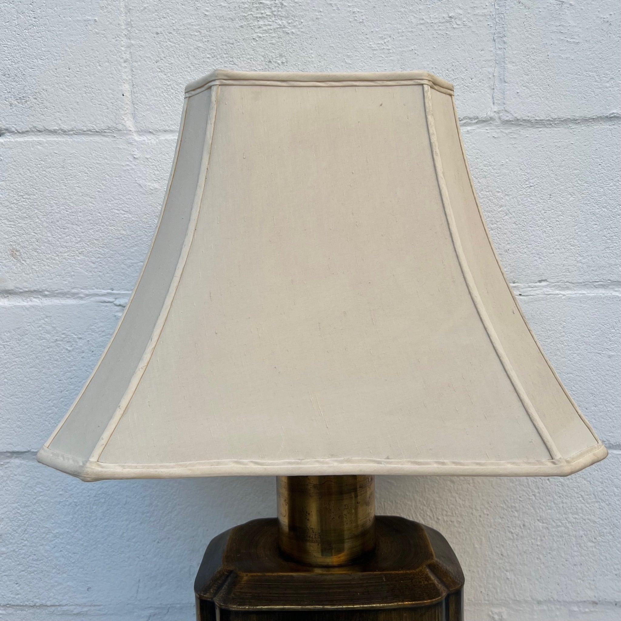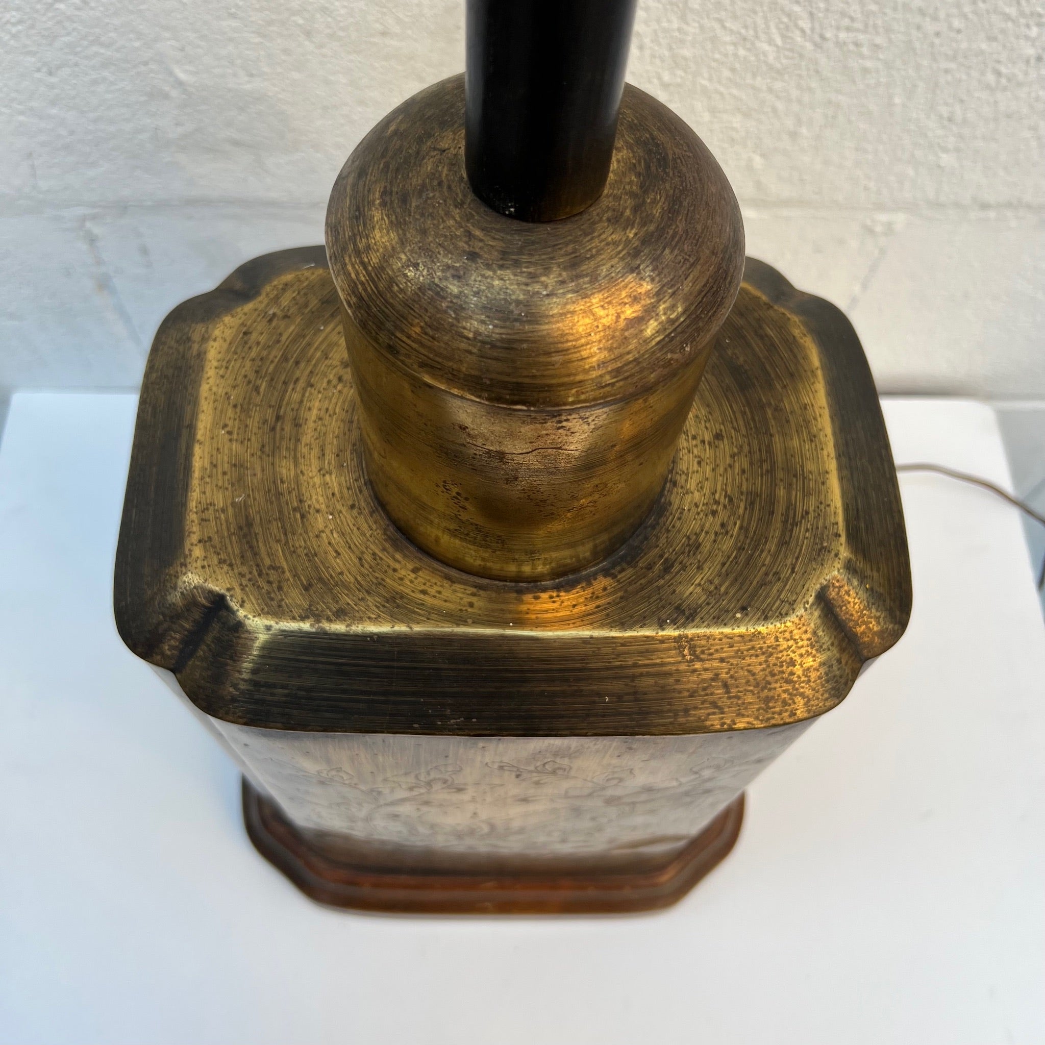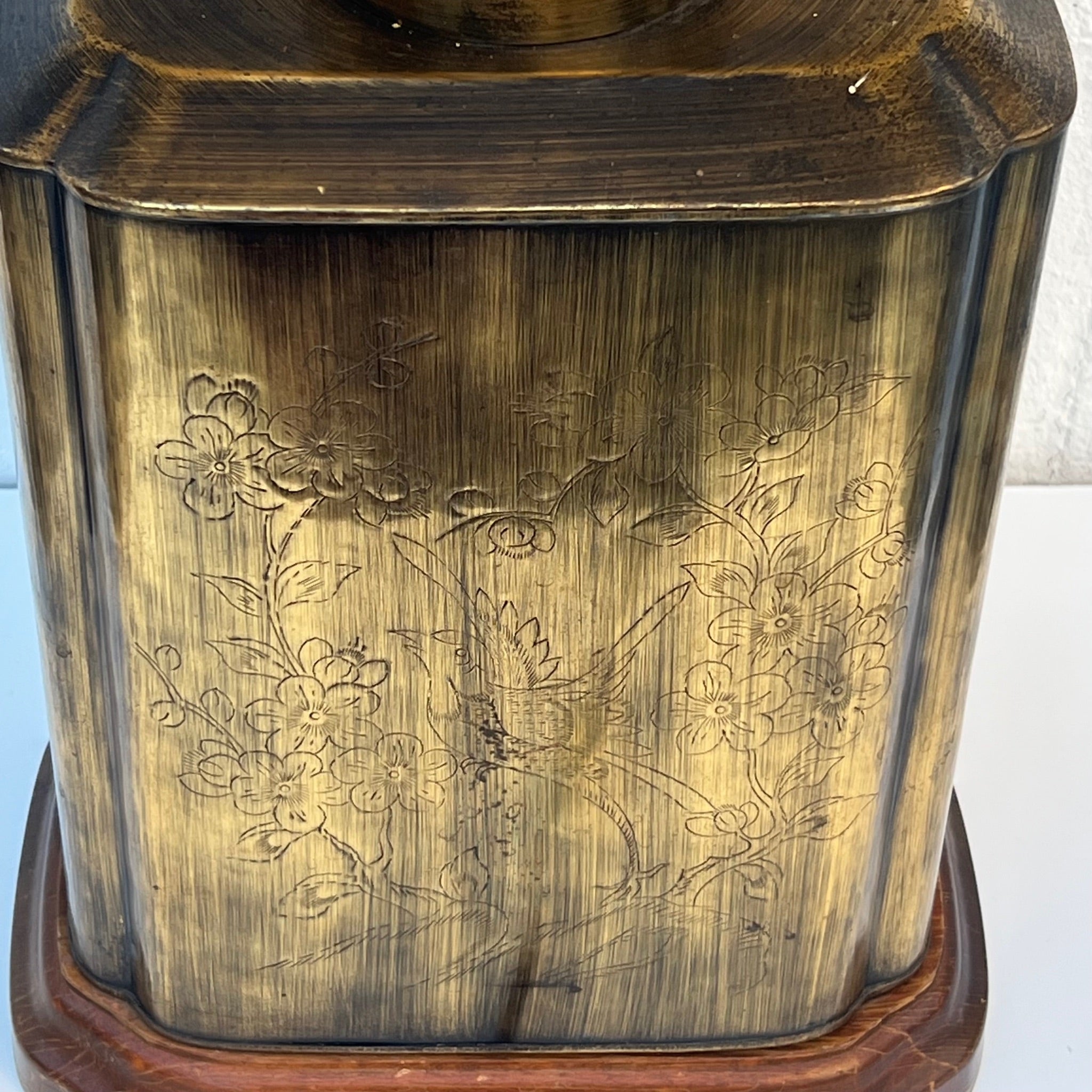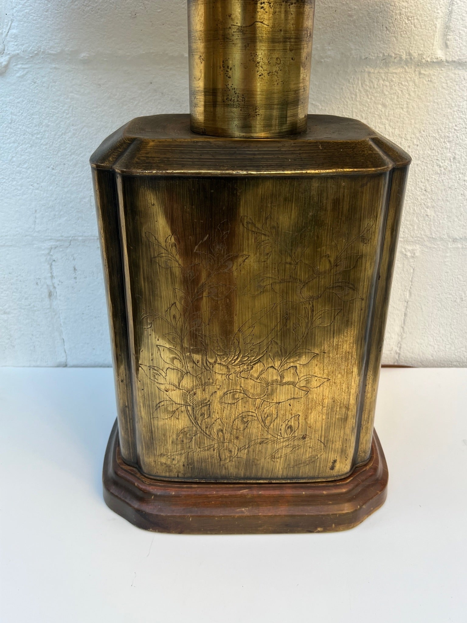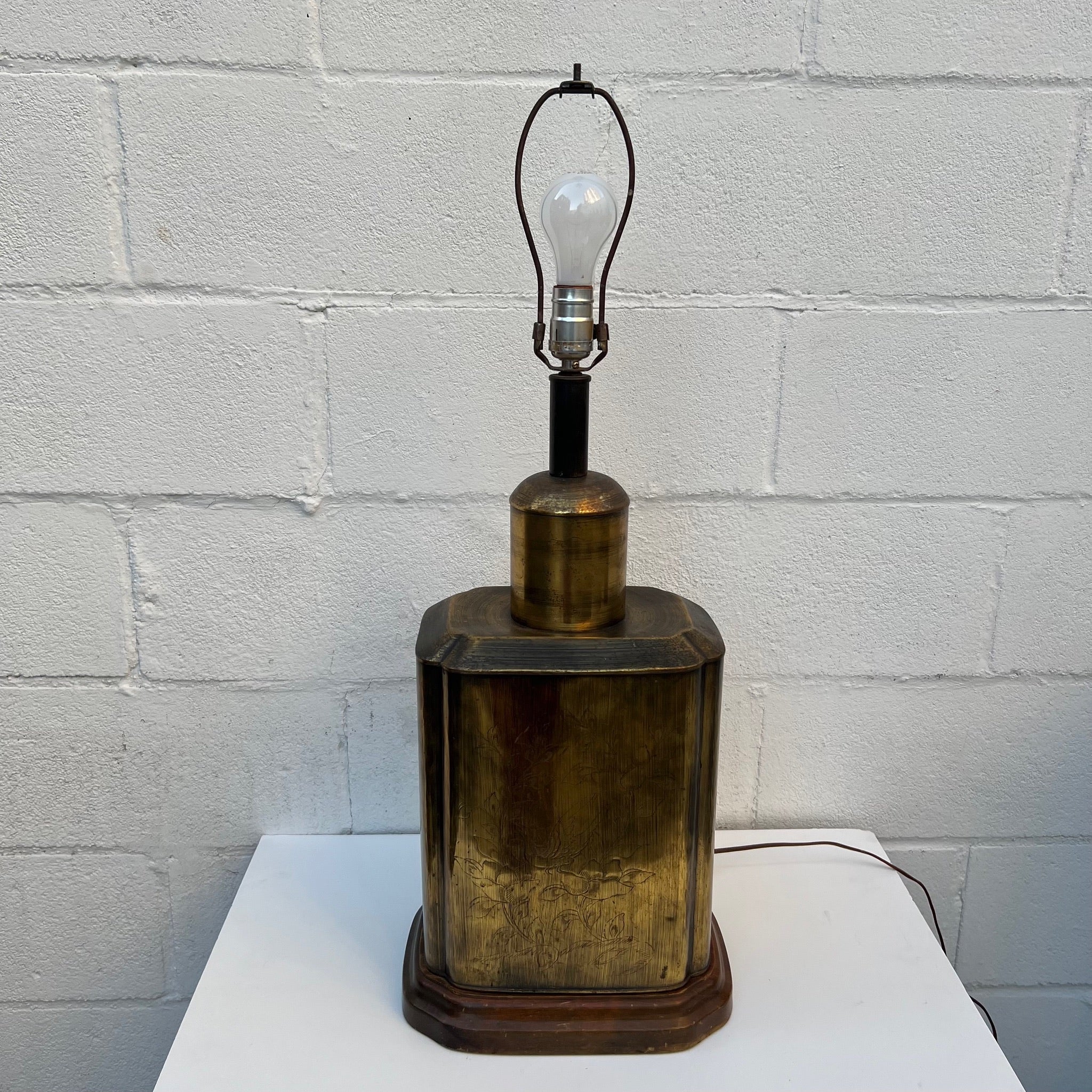 This is ONE LARGE beautiful lamp. Mid Century / Hollywood Regency or Chinoiserie piece - characterized by its brass tea caddy (canister) style base. The lamp features a rectangular, patinated brass body often mounted on a wooden base. Etched Chinoiserie scenes depicting nature, birds, or foliage. Quality off white lined shade, some slight dust on it.