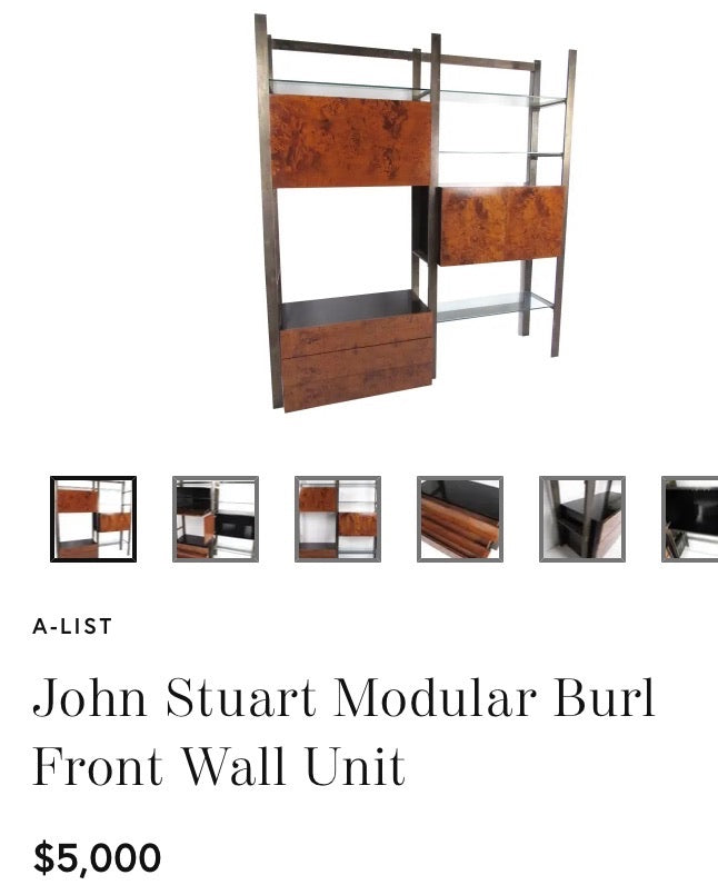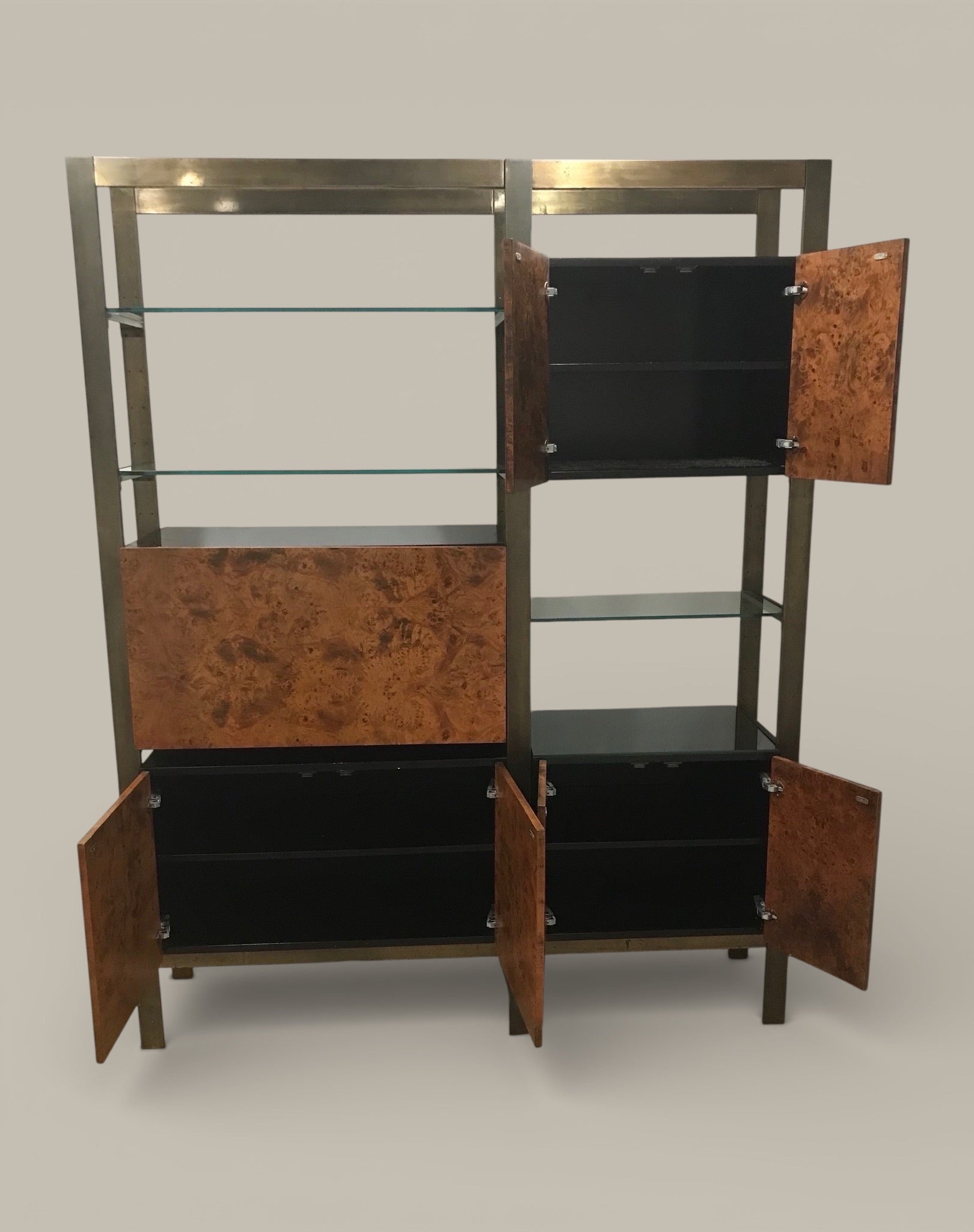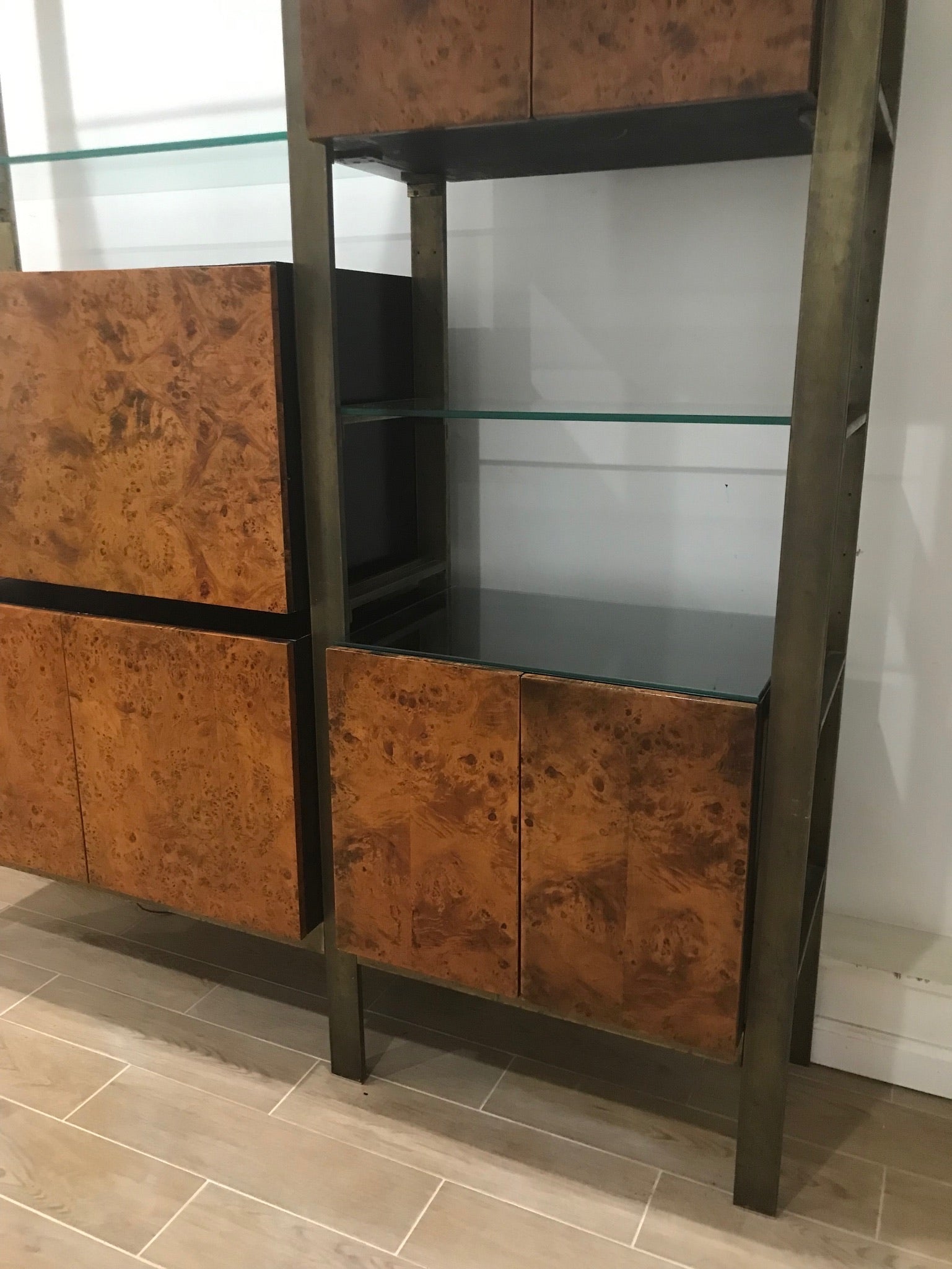Mid-Century Milo Baughman for John Stuart Burl Wood, Brass, Glass Wall Unit , Made in Spain FREE CURBSIDE DELIVERY TO NYC BOROUGHS