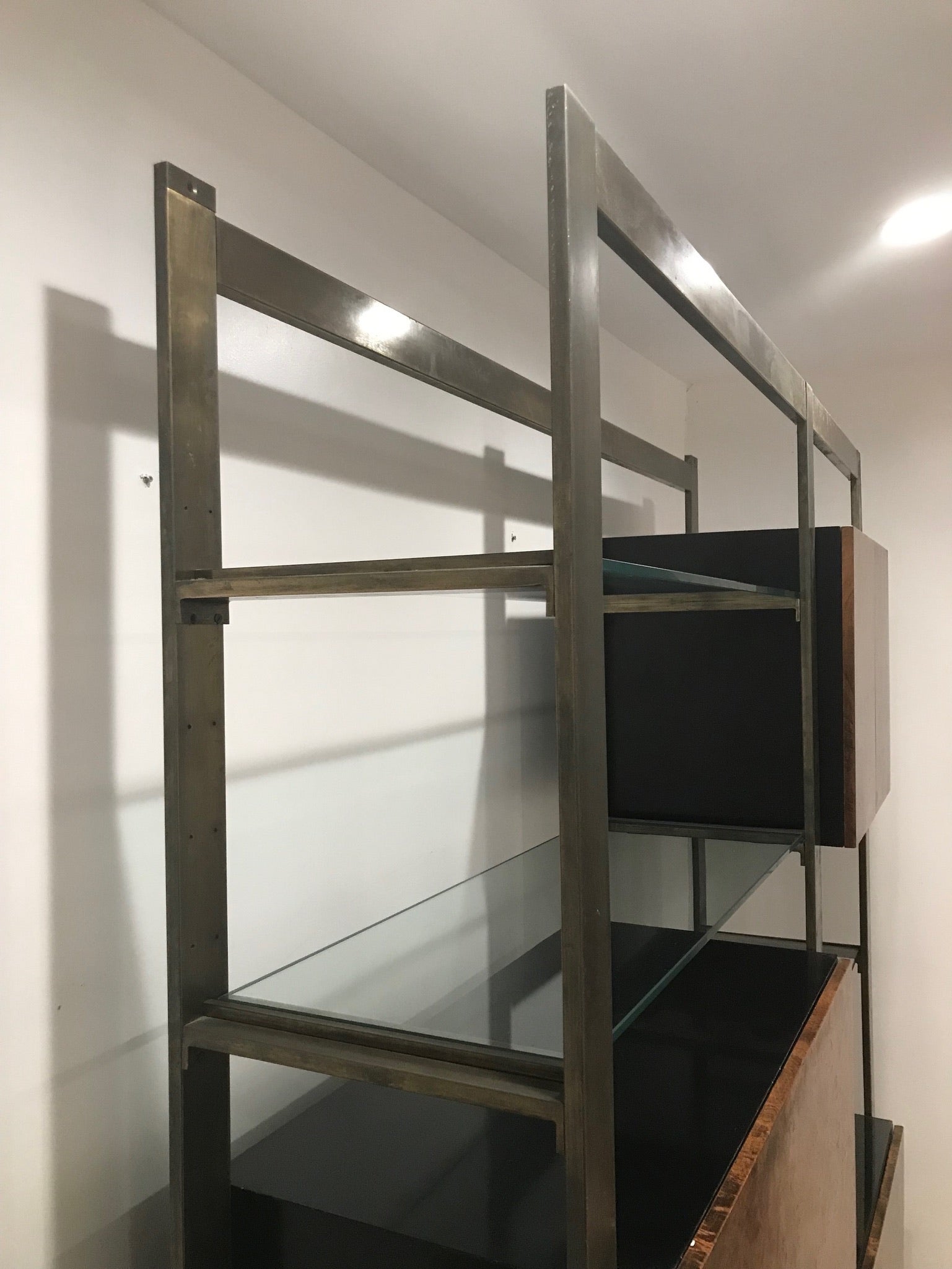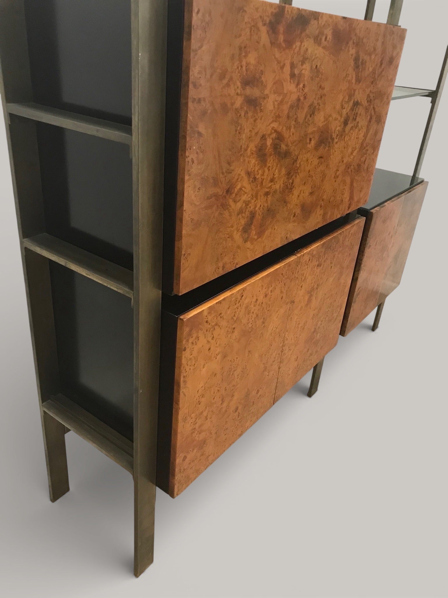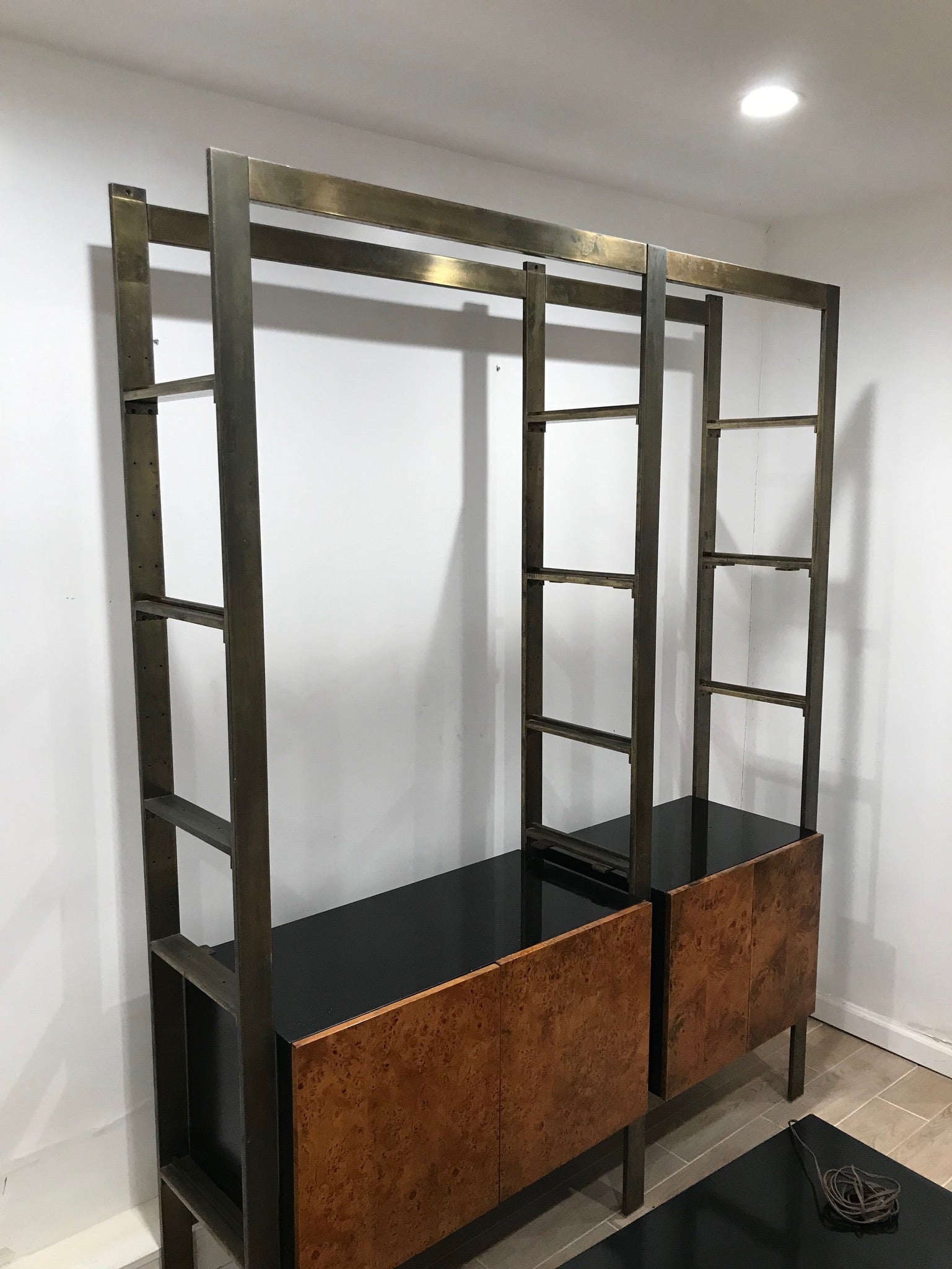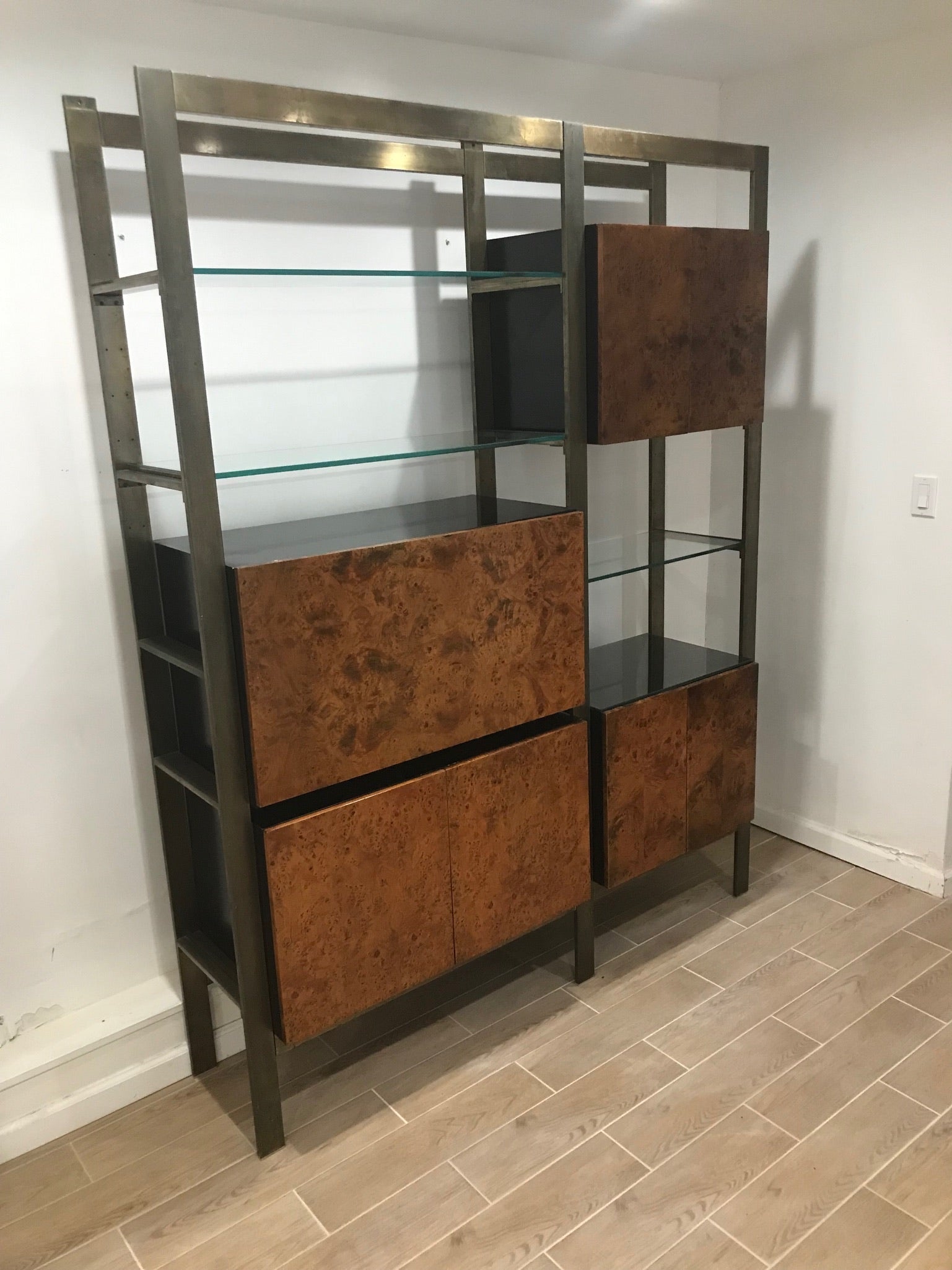 Beautiful Vintage original Mid Century Milo Baughman for John Stuart wall unit made of metal tubing (believed to be brass) thick glass shelves, deep black lacquered cubicles with light tone thick burl wood veneer exterior. The metal system of this unit comes apart with screws. It's not a one-piece unit. We have taken this apart and put together a few times. Note- The larger lower left cubicle - the hardware - the folding lid support hinges that turns the door into a flat shelf is broken. (see pic) It can be fixed. We will see if maybe we can fix it before pickup. Some minor damages on the black lacquer a mostly on areas not seen. These pieces are hard to come as time goes by. Located in our storage in Astoria, NY at the moment for easy pick up and parking. Made in Spain. This pieces retail for to $4-$5,000. For the price posted with its flaws you are getting a brand name MCM piece with resale value.