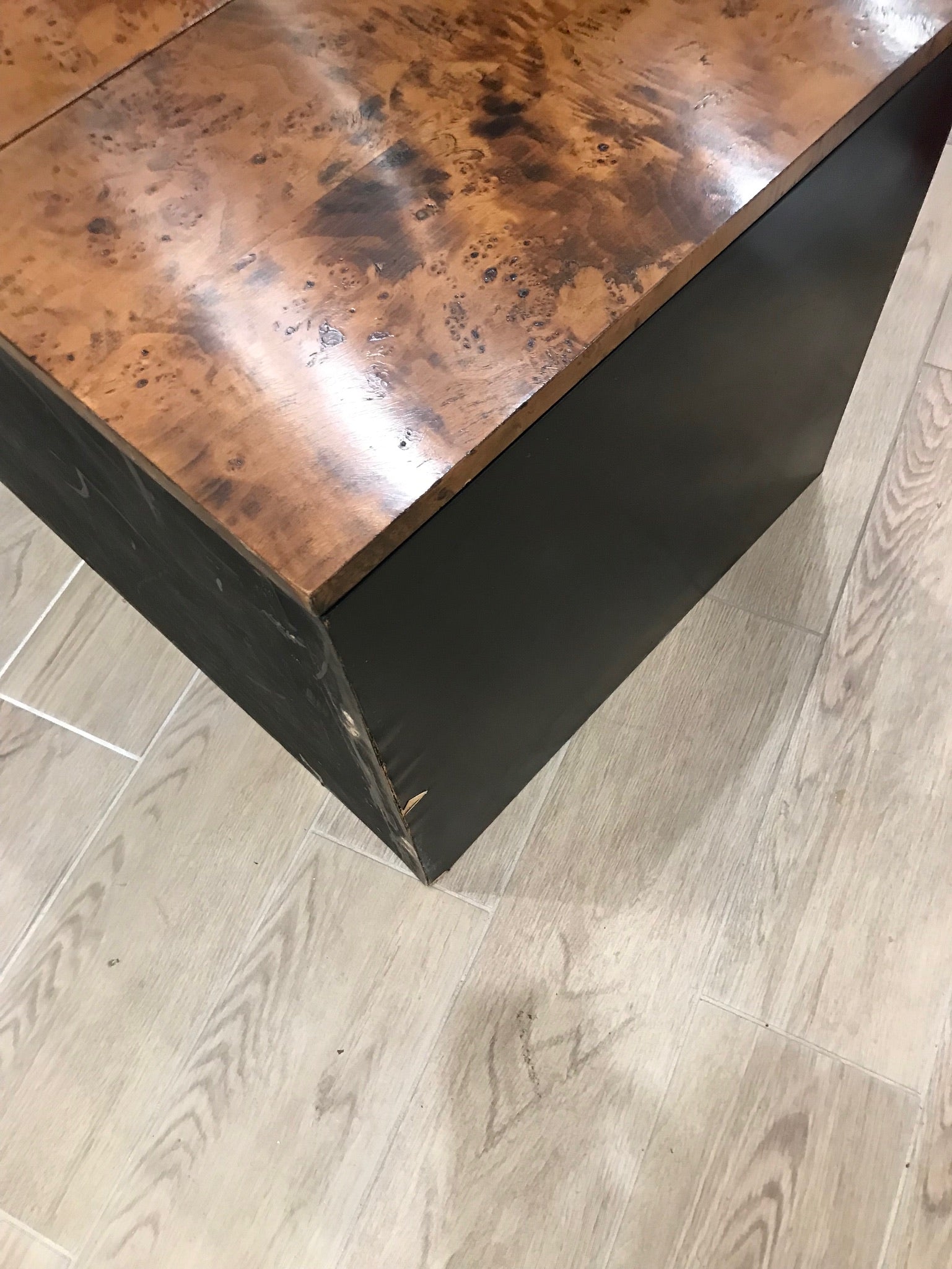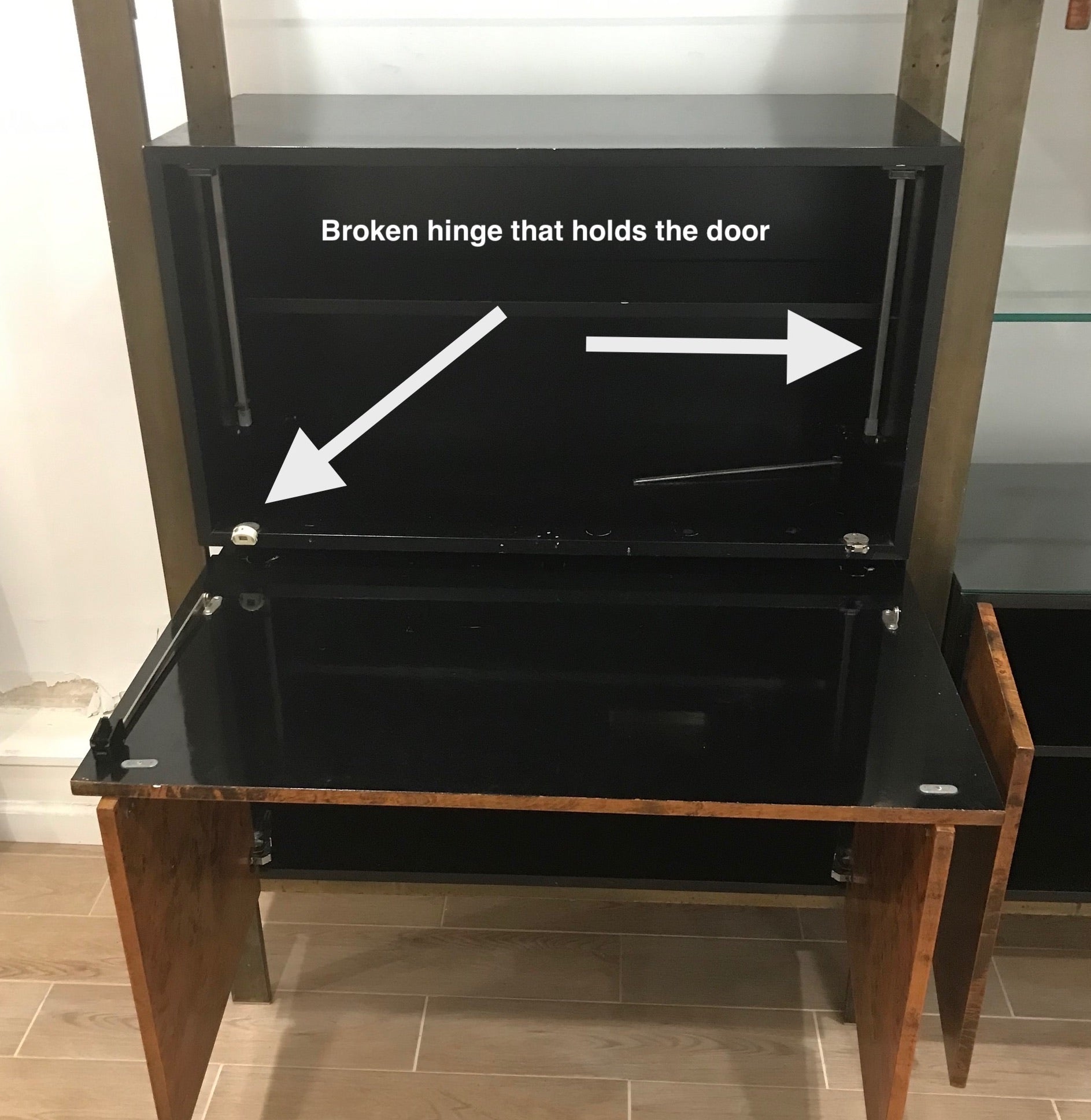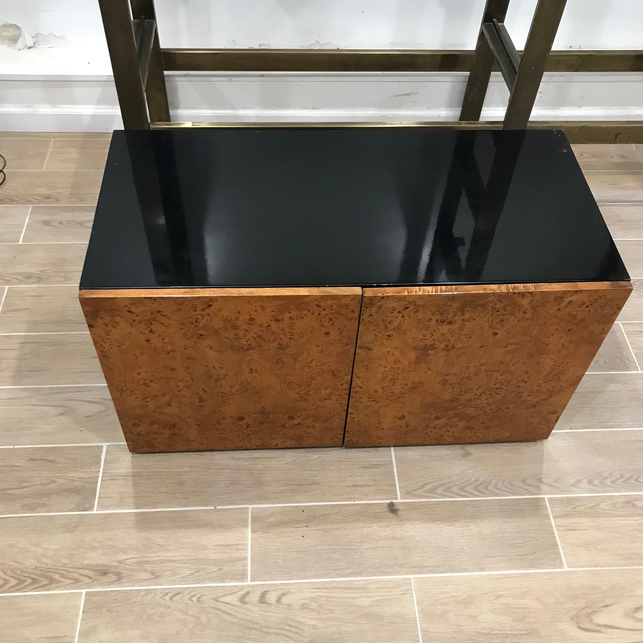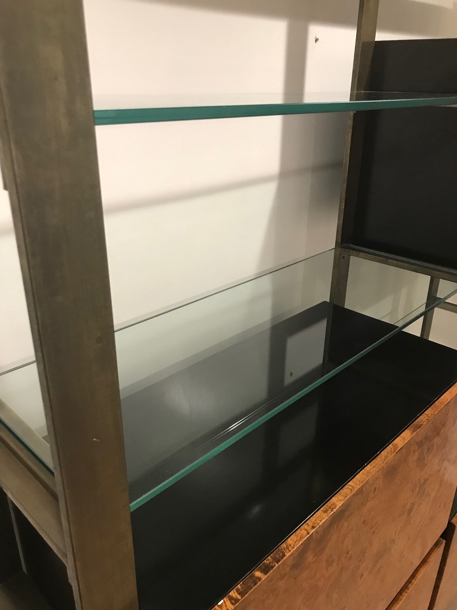 Beautiful Vintage original Mid Century Milo Baughman for John Stuart wall unit made of metal tubing (believed to be brass) thick glass shelves, deep black lacquered cubicles with light tone thick burl wood veneer exterior. The metal system of this unit comes apart with screws. It's not a one-piece unit. We have taken this apart and put together a few times. Note- The larger lower left cubicle - the hardware - the folding lid support hinges that turns the door into a flat shelf is broken. (see pic) It can be fixed. We will see if maybe we can fix it before pickup. Some minor damages on the black lacquer a mostly on areas not seen. These pieces are hard to come as time goes by. Located in our storage in Astoria, NY at the moment for easy pick up and parking. Made in Spain. This pieces retail for to $4-$5,000. For the price posted with its flaws you are getting a brand name MCM piece with resale value.