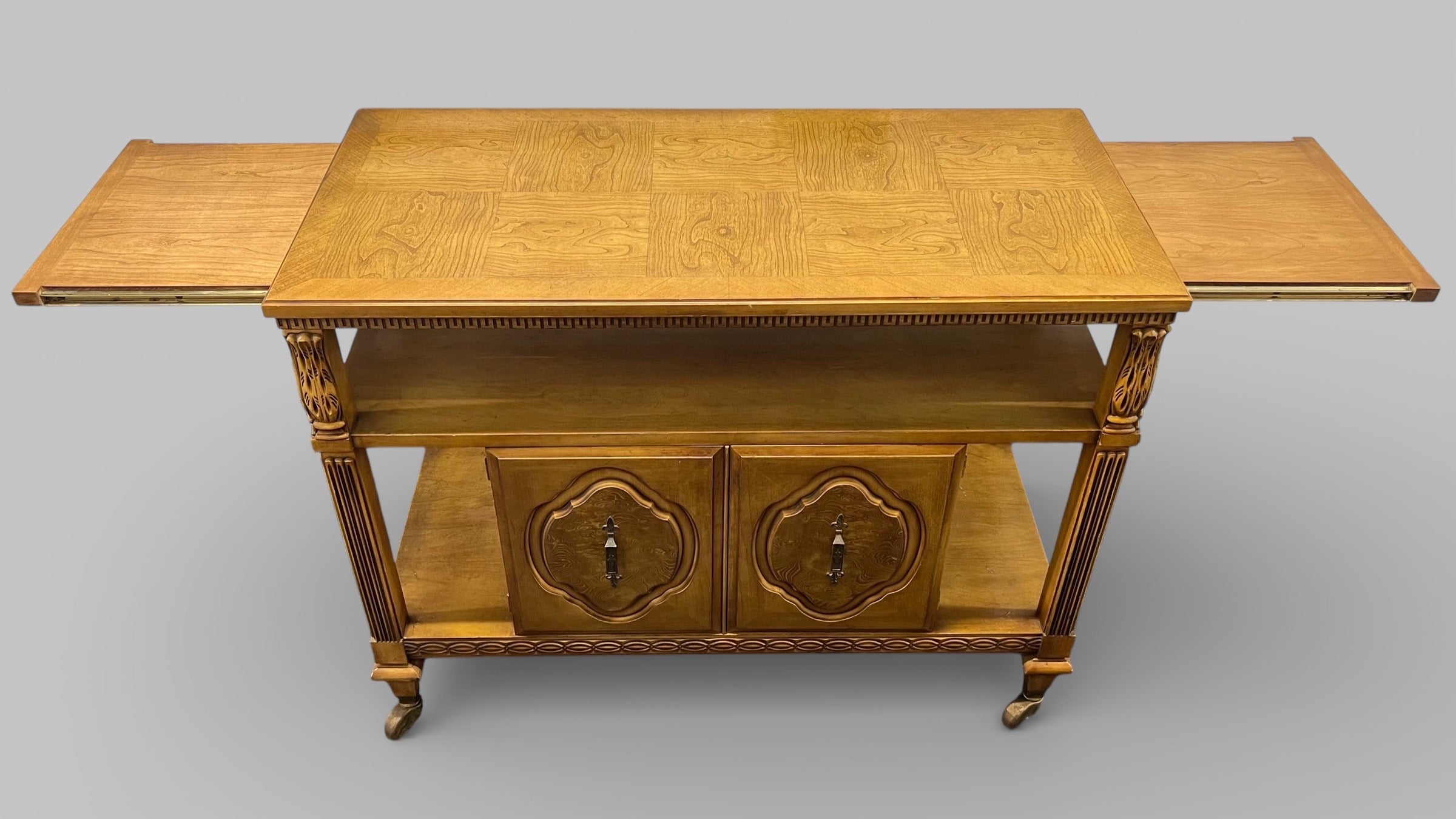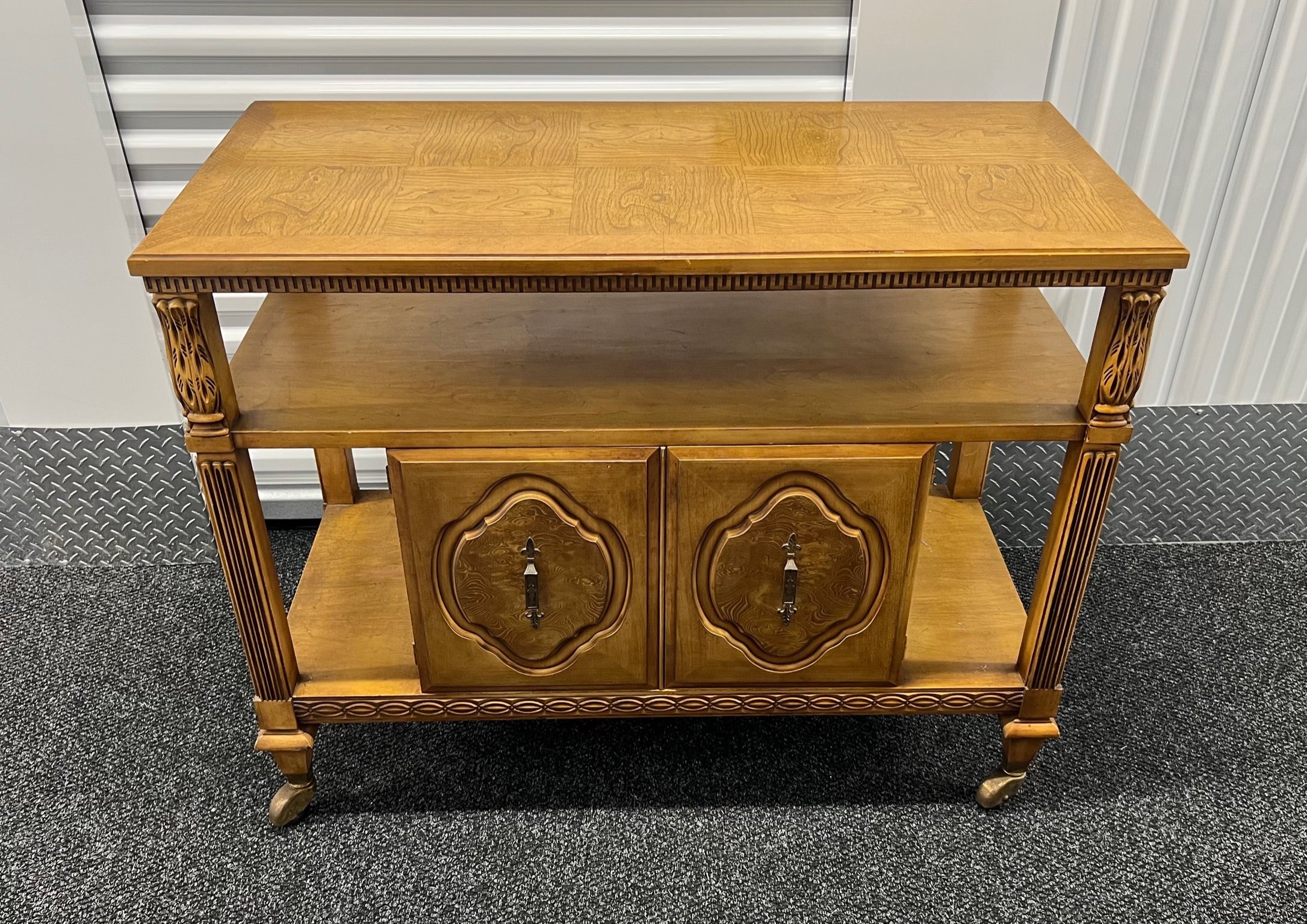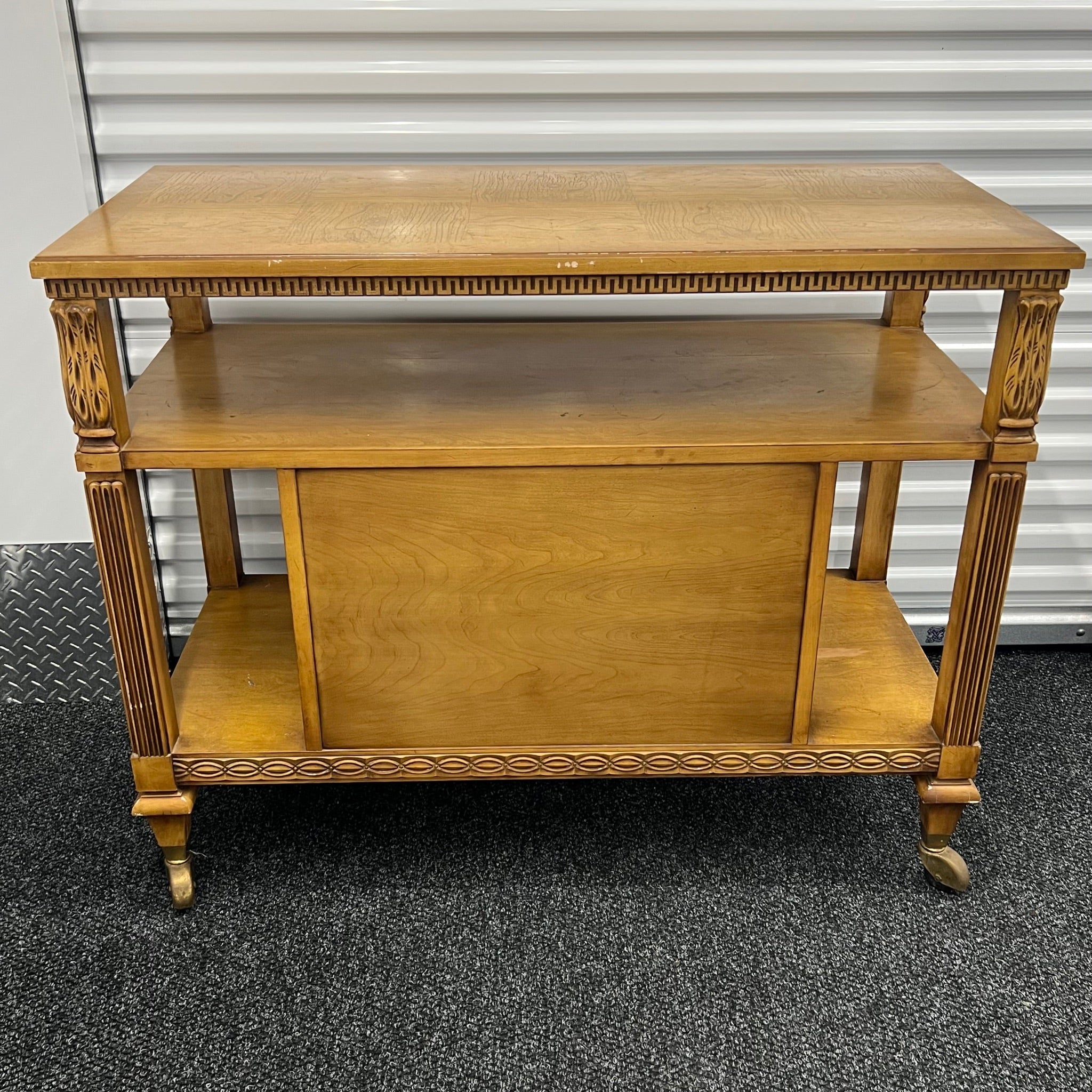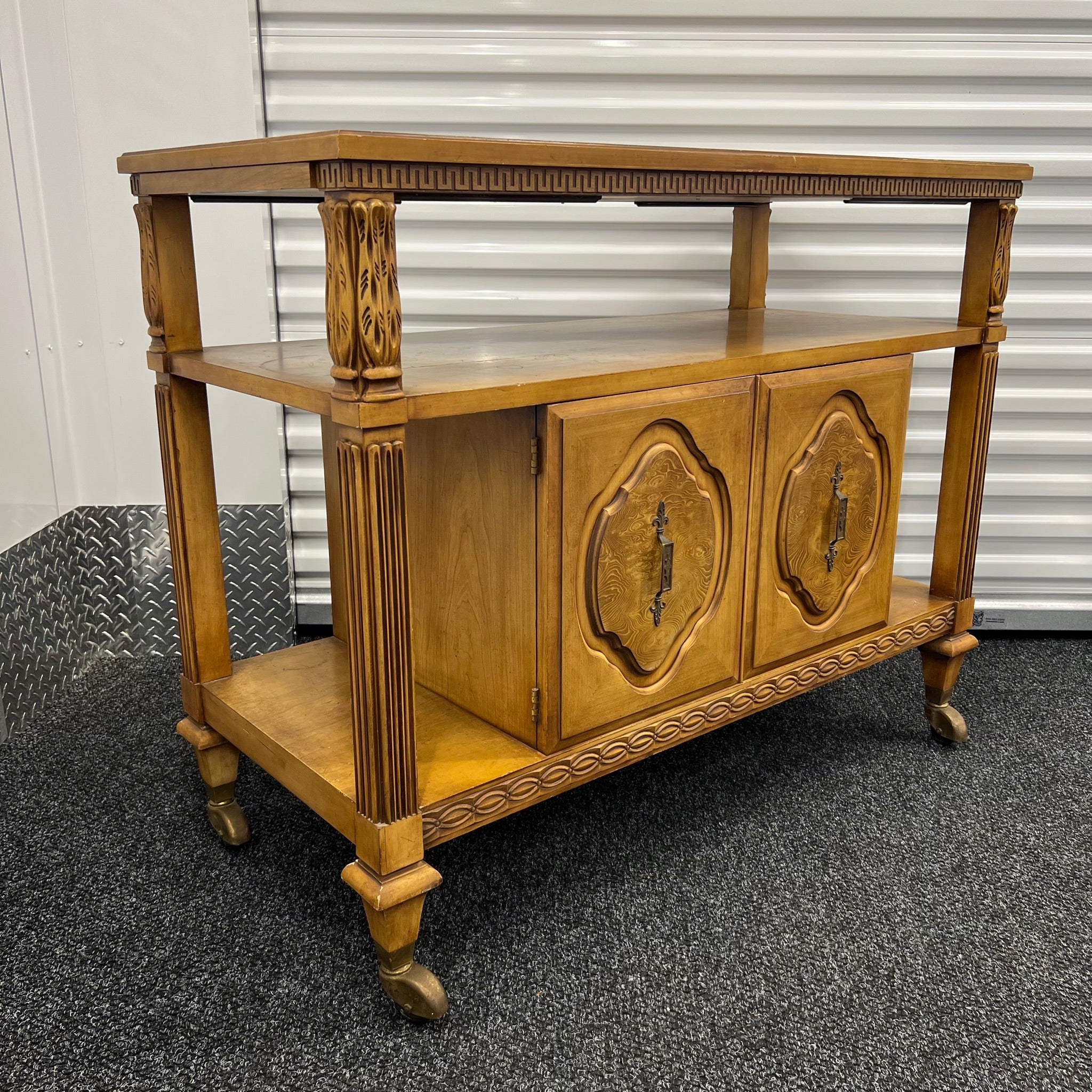 A bar cart with 2 hidden extensions and large storage with 2 doors with original hardware. Carved wooden features and burl wood throughout. The well hidden extensions slide out, they are sturdy and well made. Nice large brass caster wheels for easy movement, they can also be shined. Large see thru shelf and additional compartments at the bottom. Some minor nicks here and there but nothing to crazy. We will clean it as much as possible before pick up. This versatile piece can be a great dry bar cart, TV Stand or Sofa Table, Entry Table, Buffet. Server even a Kitchen Island. Rare classic piece of well made furniture.