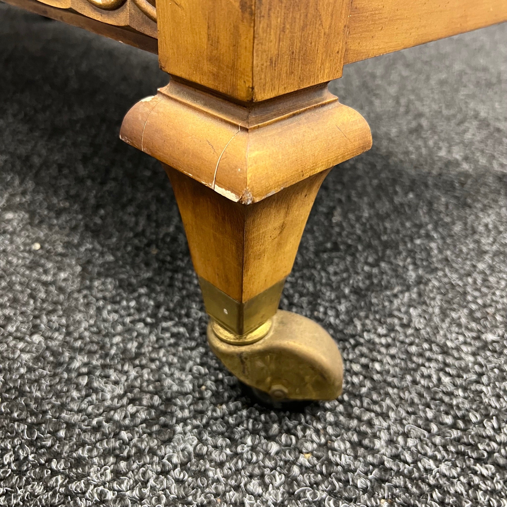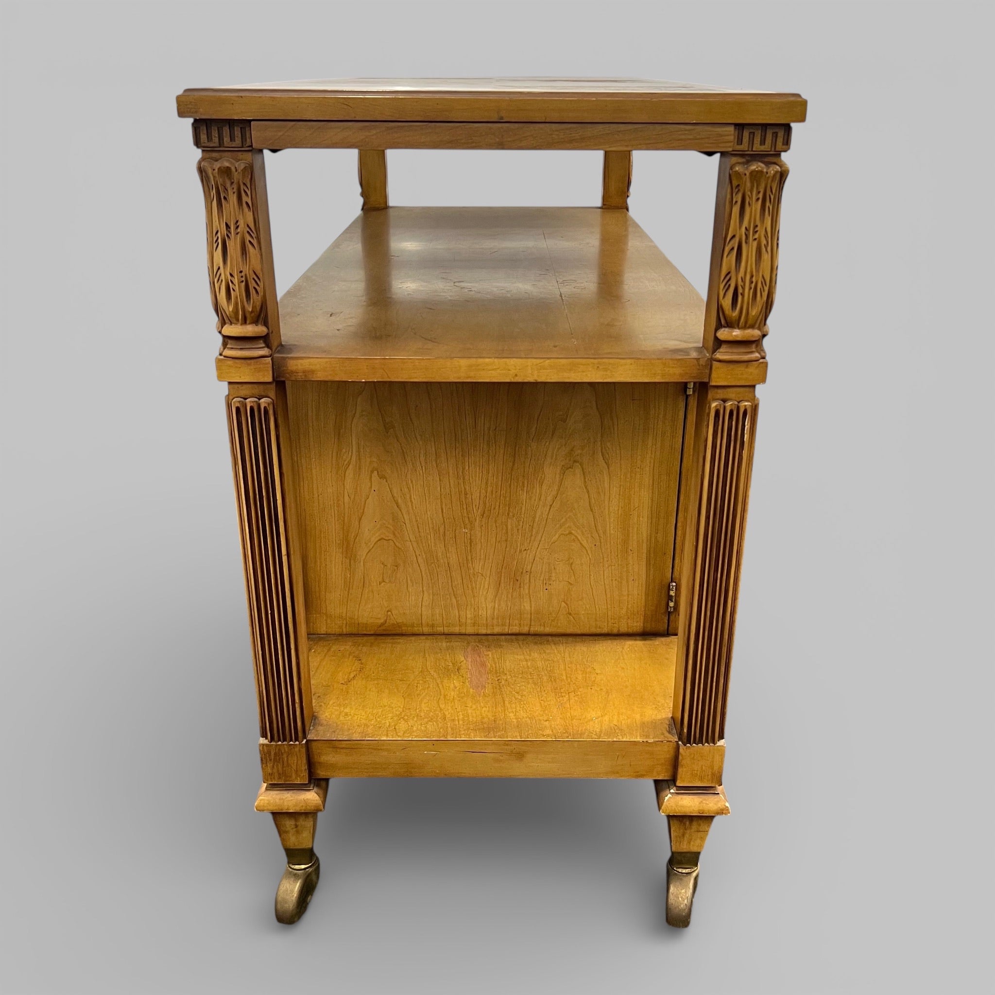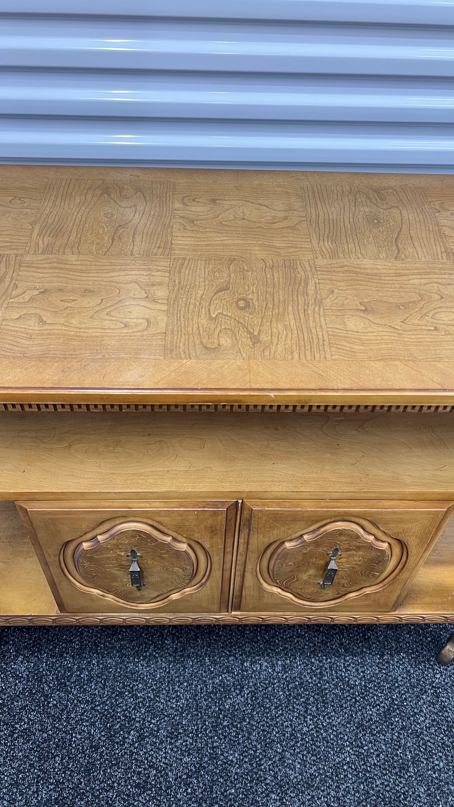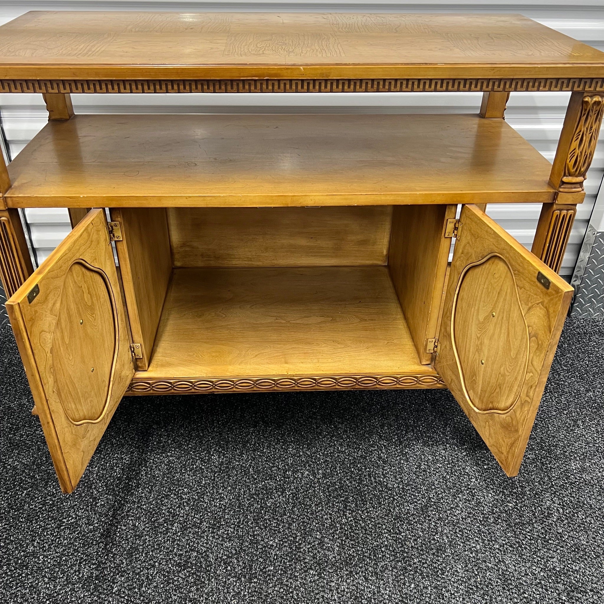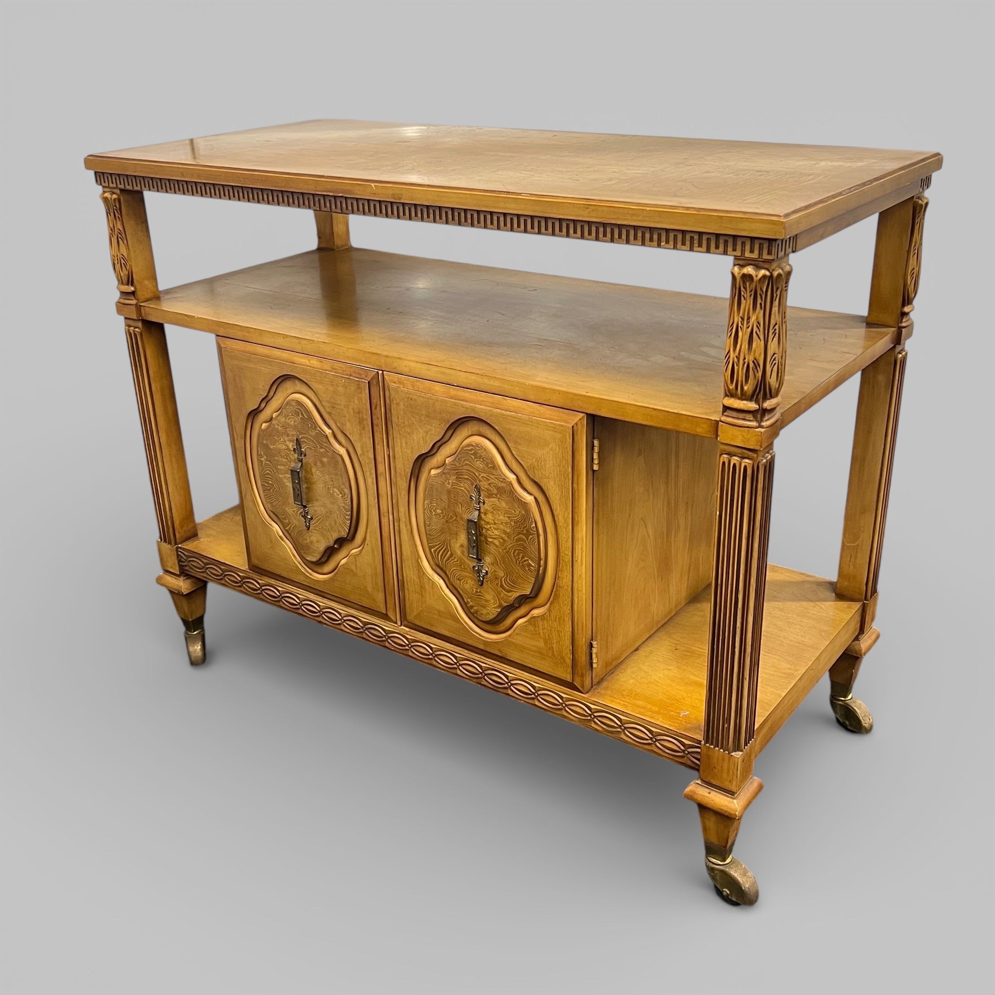 A bar cart with 2 hidden extensions and large storage with 2 doors with original hardware. Carved wooden features and burl wood throughout. The well hidden extensions slide out, they are sturdy and well made. Nice large brass caster wheels for easy movement, they can also be shined. Large see thru shelf and additional compartments at the bottom. Some minor nicks here and there but nothing to crazy. We will clean it as much as possible before pick up. This versatile piece can be a great dry bar cart, TV Stand or Sofa Table, Entry Table, Buffet. Server even a Kitchen Island. Rare classic piece of well made furniture.