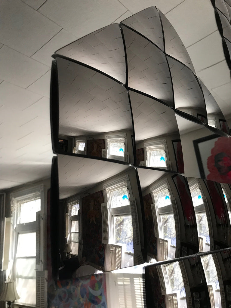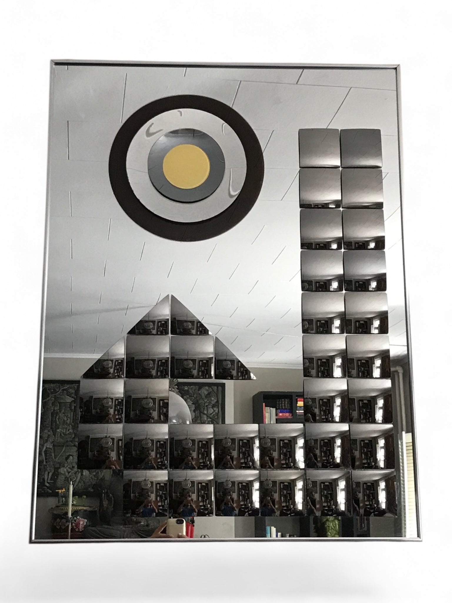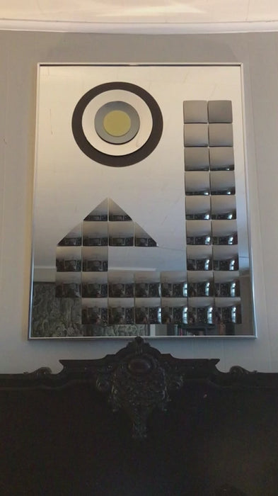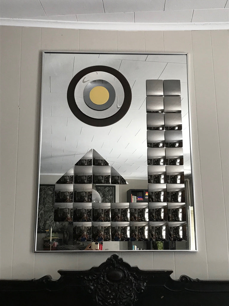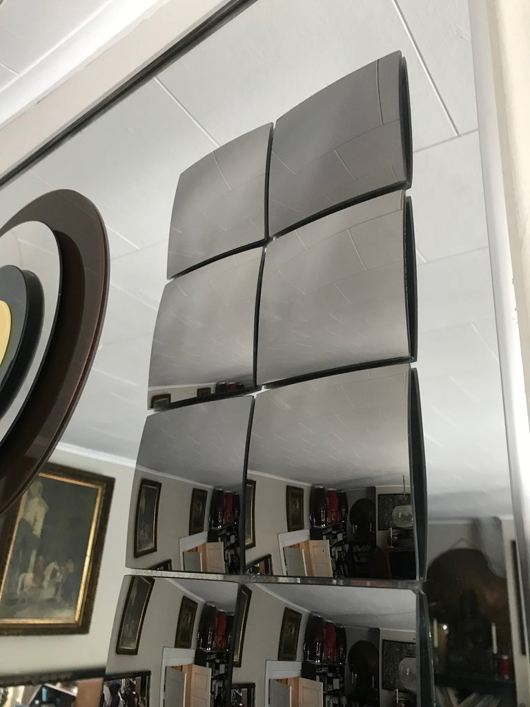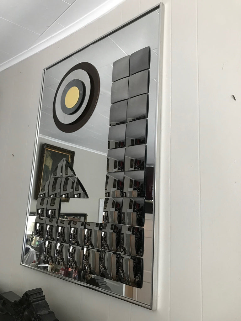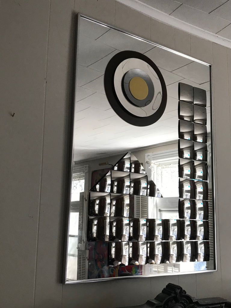 Don't snooze on the beauty ! This is a Vintage Mid Century Rectangle Mirror. It's a Rare HAL BIENENFELD Art Mirror with Raised Bullseye Design and Convex Square Blocks.